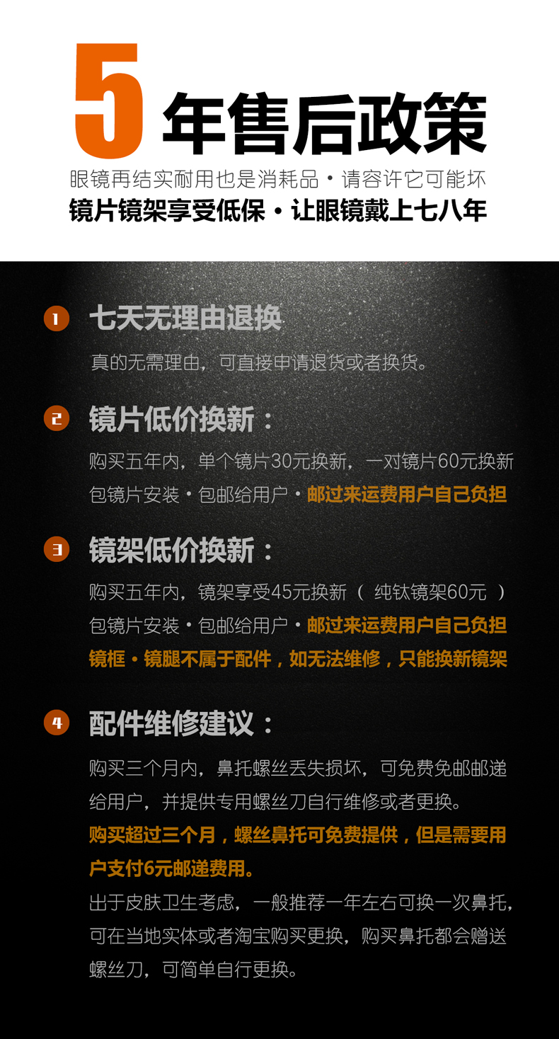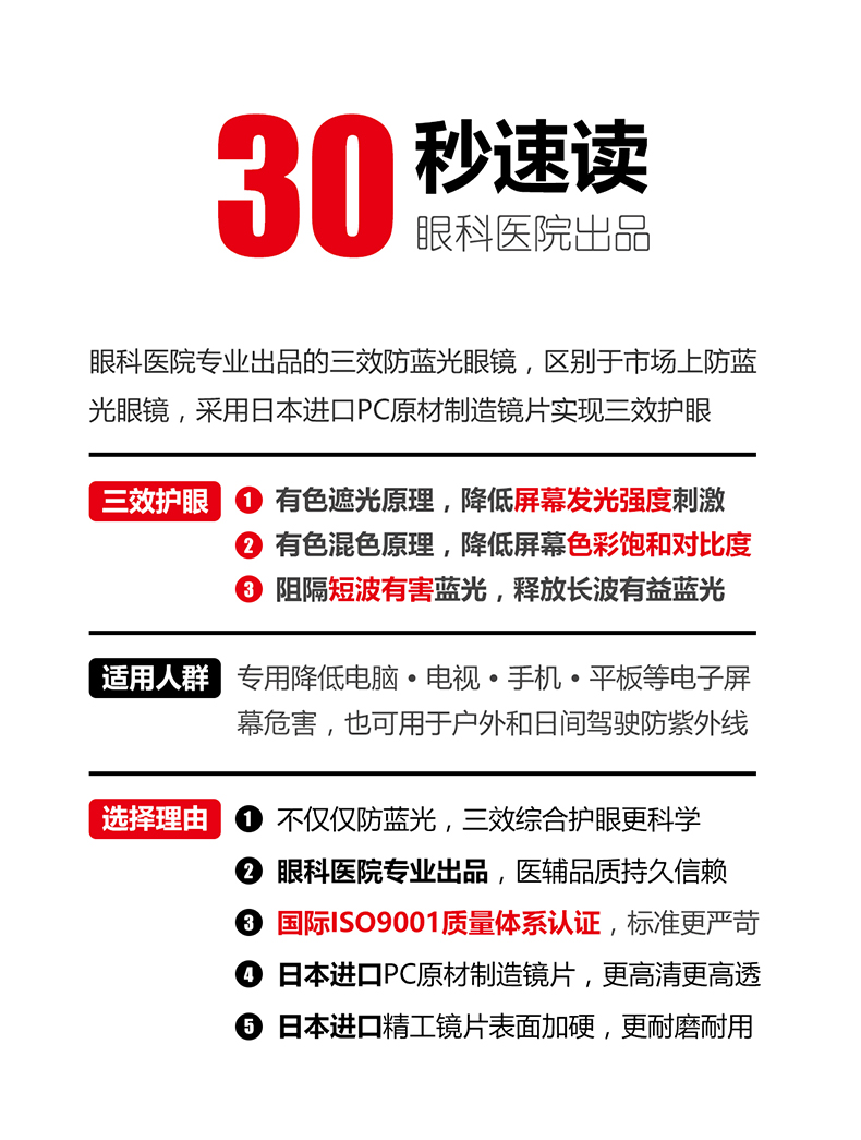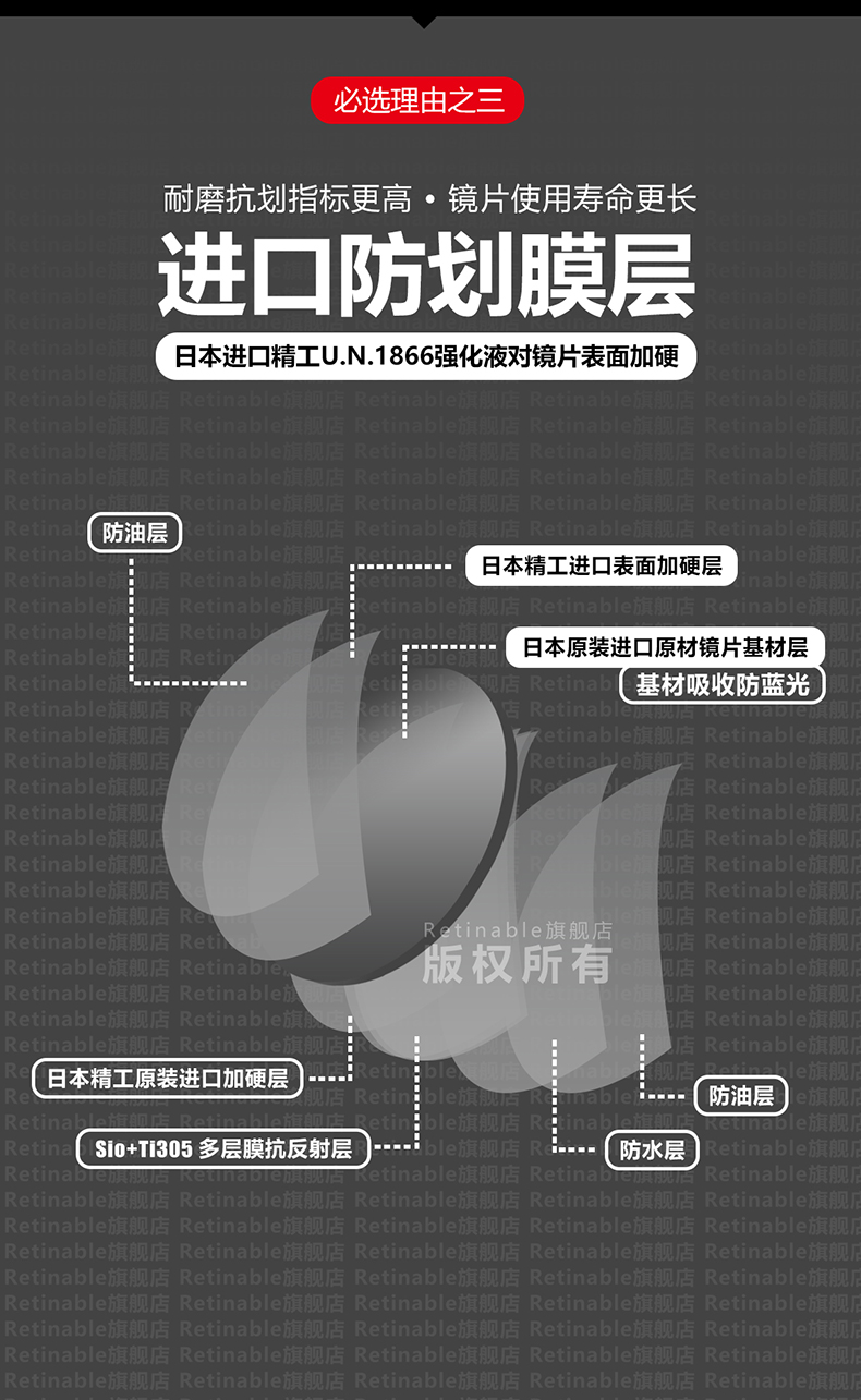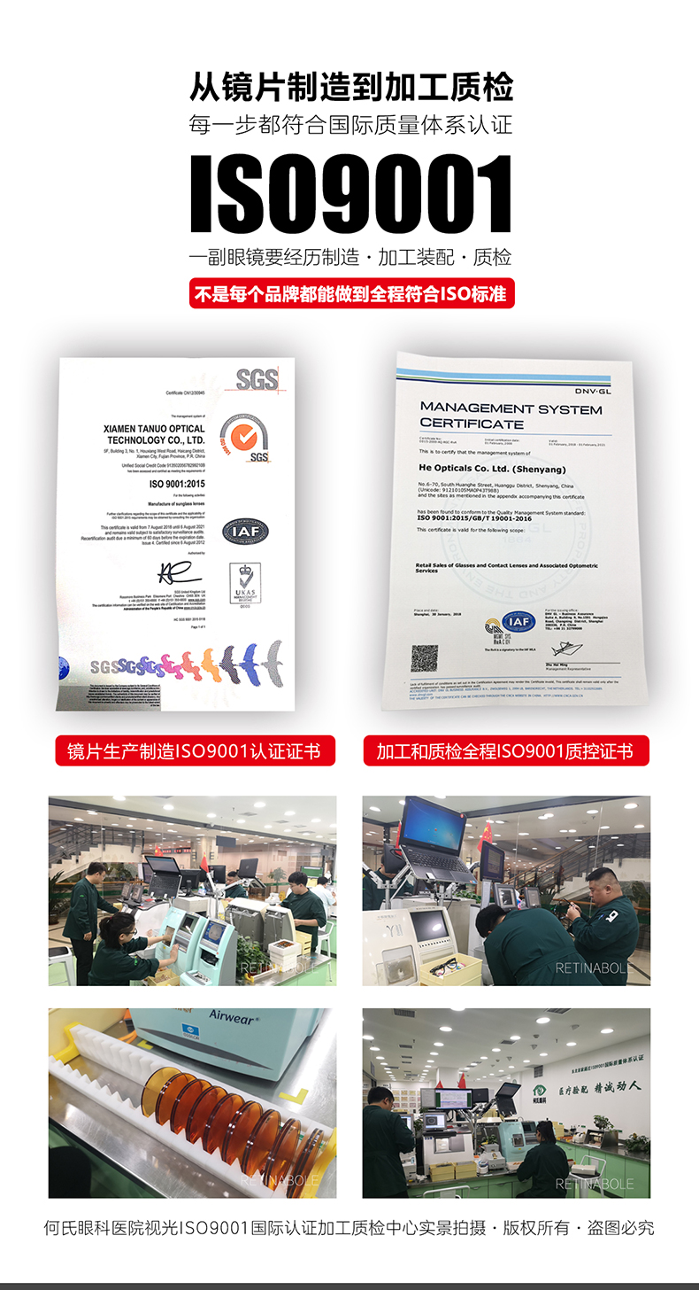 镜片抗划采用日本原装进口精工强化液,耐磨防划寿命长,制造、加工、质检全程符合ISO9001认证。特殊高弹TR90镜腿,贴合头部,防掉落又不夹脸,大角度掰也不会坏,可自行轻松拆卸。