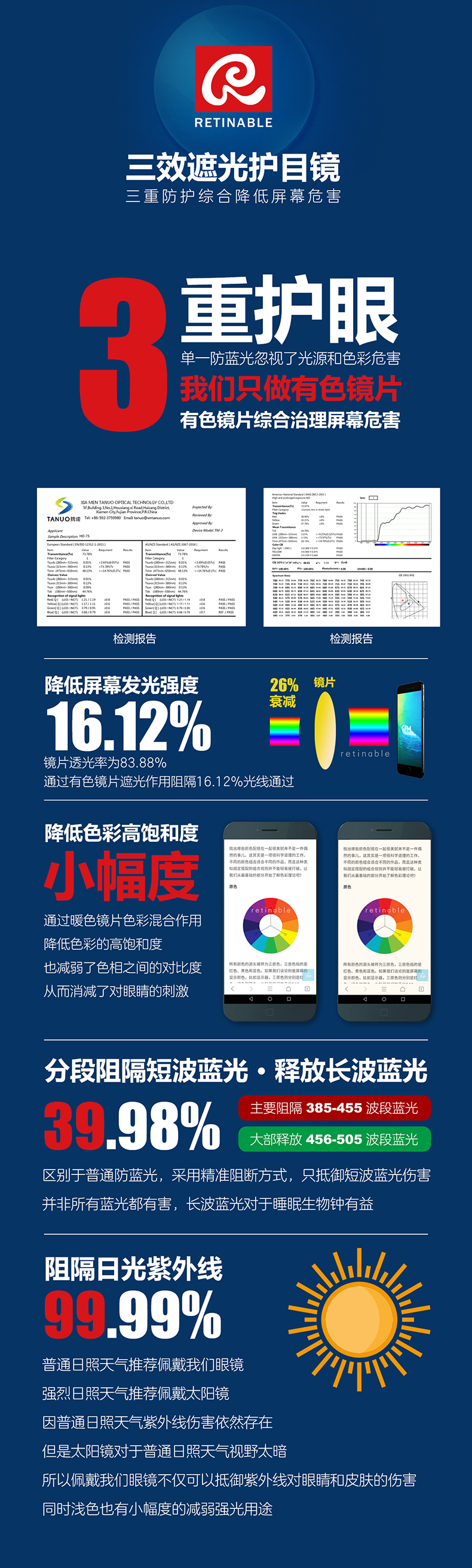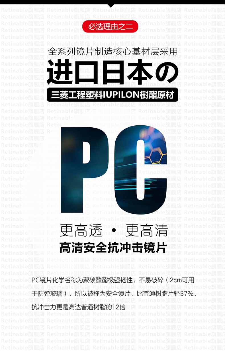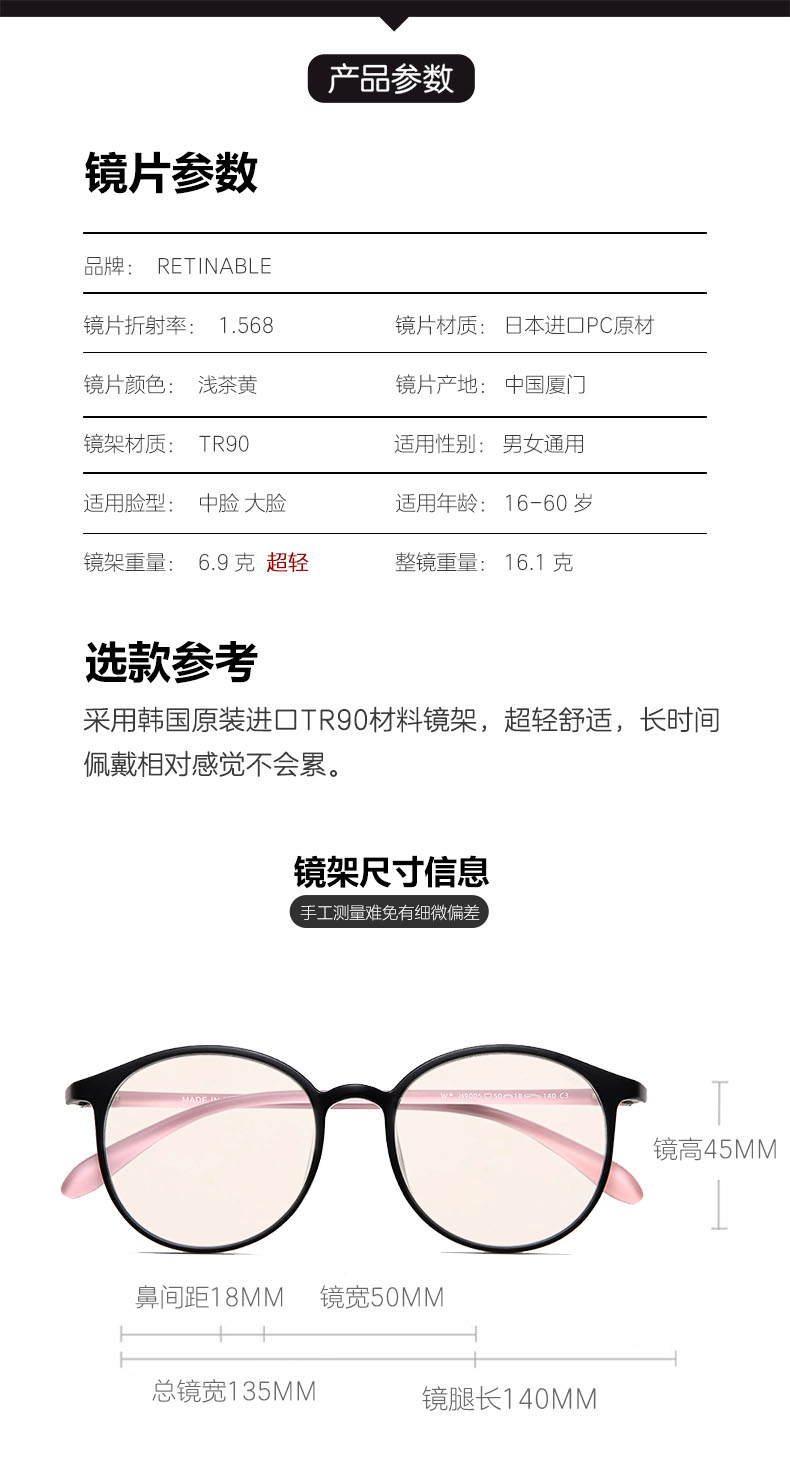 这款Ratinable 防蓝光护目眼镜,适合成年人,TR90镜架,柔韧抗摔,镜片采用日本三菱进口PC原材制造,高清高透高韧性,三重护眼,降低屏幕发光强度刺激、降低色彩高饱和度刺激以及阻隔短波蓝光,释放有益长波蓝光。