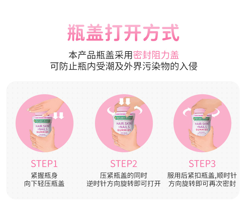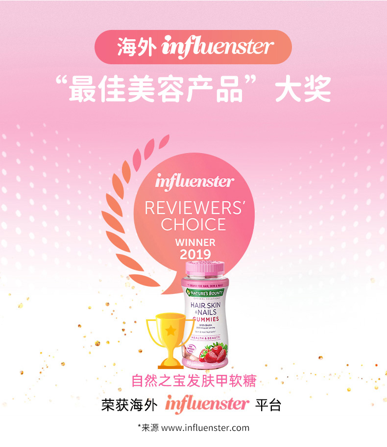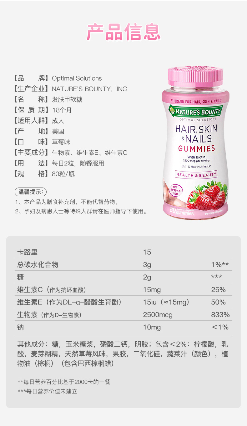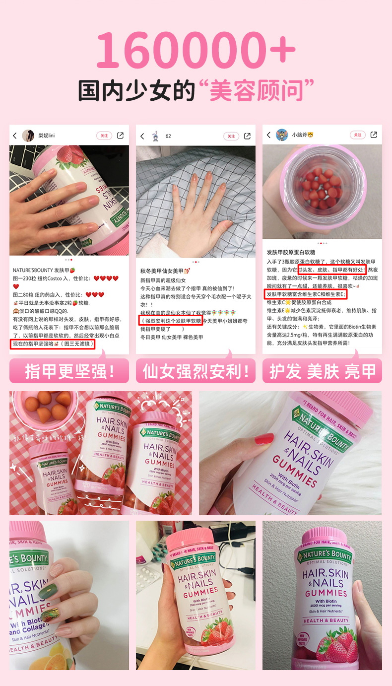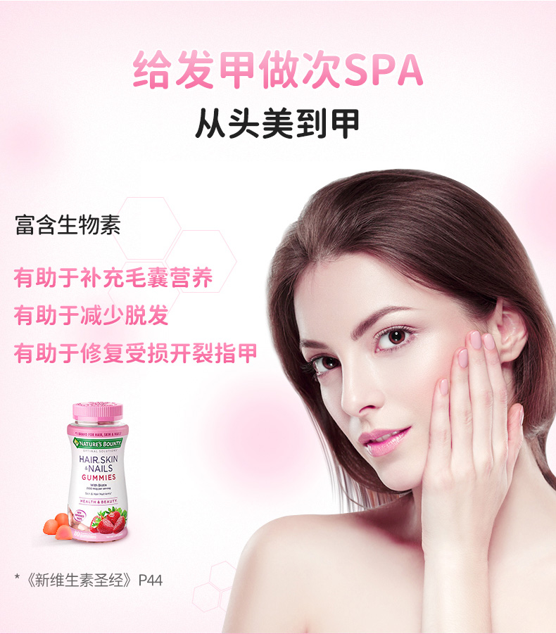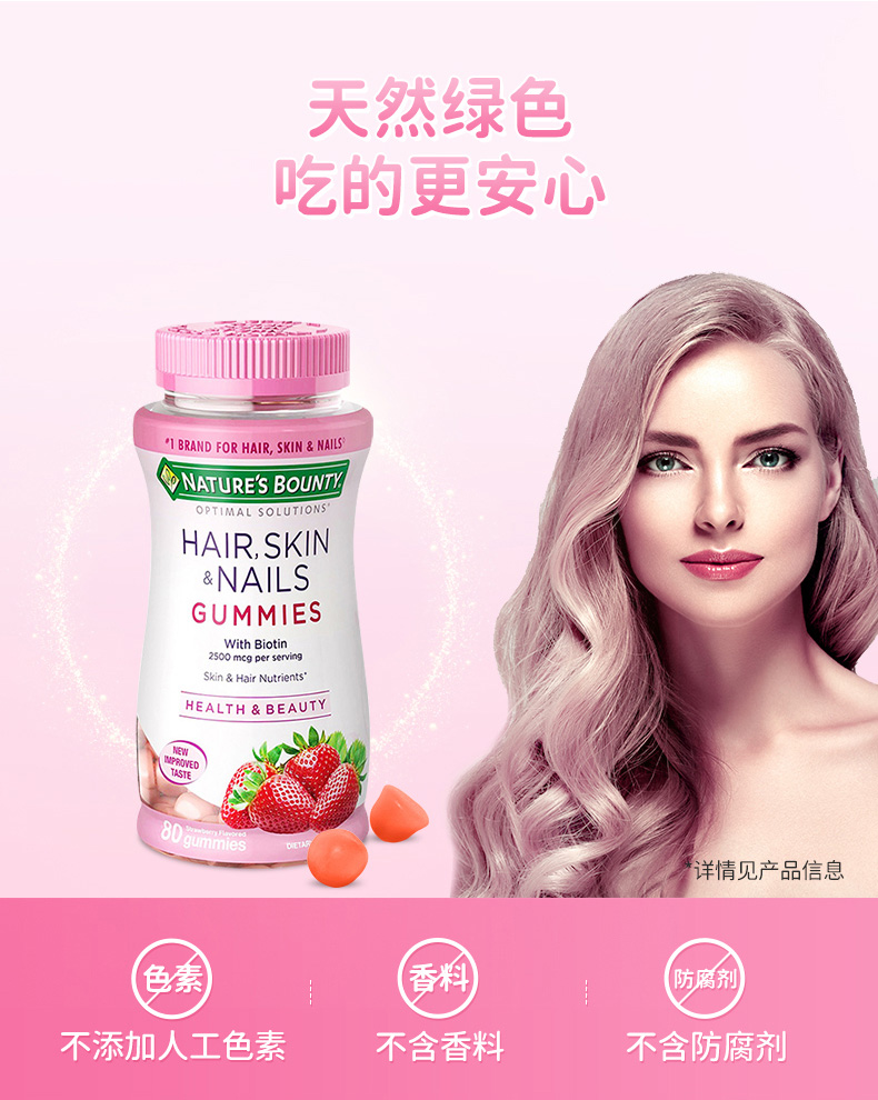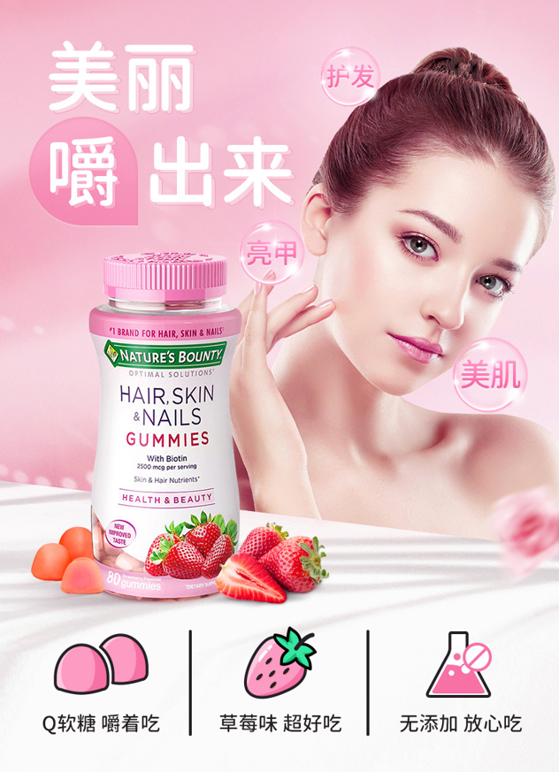 这款自然之宝 胶原蛋白软糖,美国原装进口,主要成分是生物素、维生素C、维生素E三这大营养成分,能促进胶原蛋白的再生,达到抗氧化养护皮肤、减少脱发、修复开裂指甲的功效。