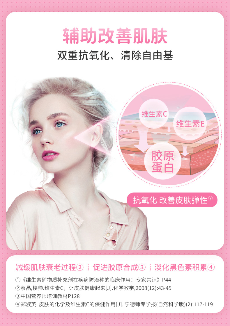 维生素C、维生素E:双重抗氧化、清楚自由基,改善肌肤弹性。
