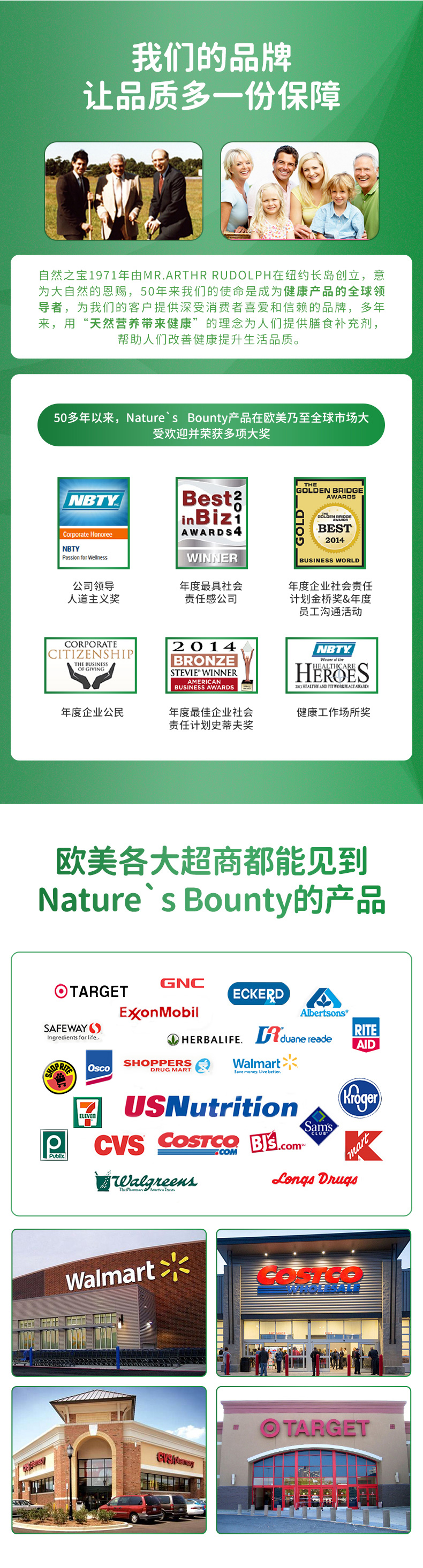 “自然之宝”为美国膳食补充剂经典品牌,成立于1971年,其生产的保 健品多从天然生物提炼而非化学合成,近50年来,自然 之宝凭借“天然营养带来健康”的理念和卓越品质,致力于帮助人类改善健康和提升生活品质。自然 之宝旗下有众多国际知名品牌,其中包括Nature’s Bounty、 Optimal Solutions等。