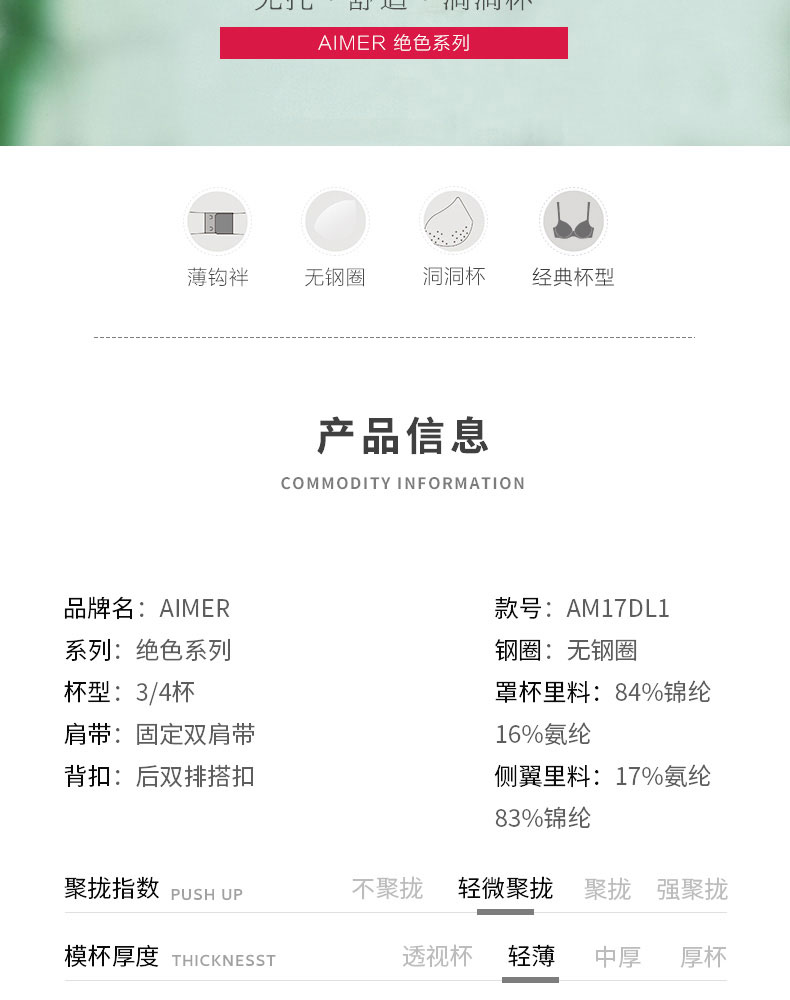 天猫爱慕官方旗舰店159元,可领70元优惠券,实付89元到手,爱慕无钢圈聚拢薄文胸,黑科技专利洞洞杯,透气干爽,夏天穿着闷热,让胸部重回舒适区,无钢圈设计,温柔契合身体,坚韧有形,女人味十足。