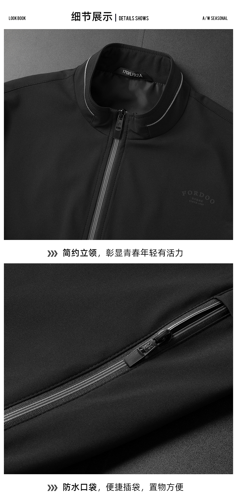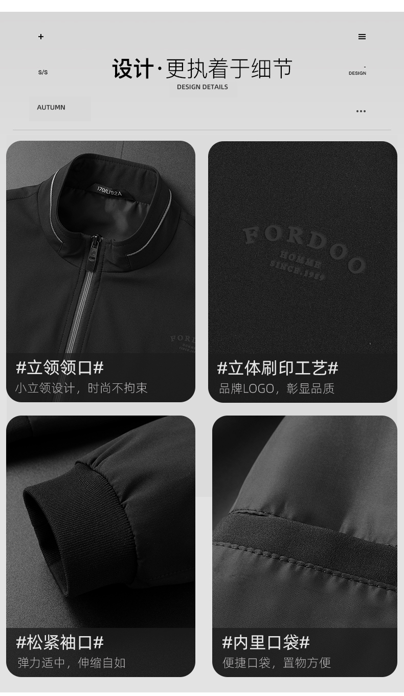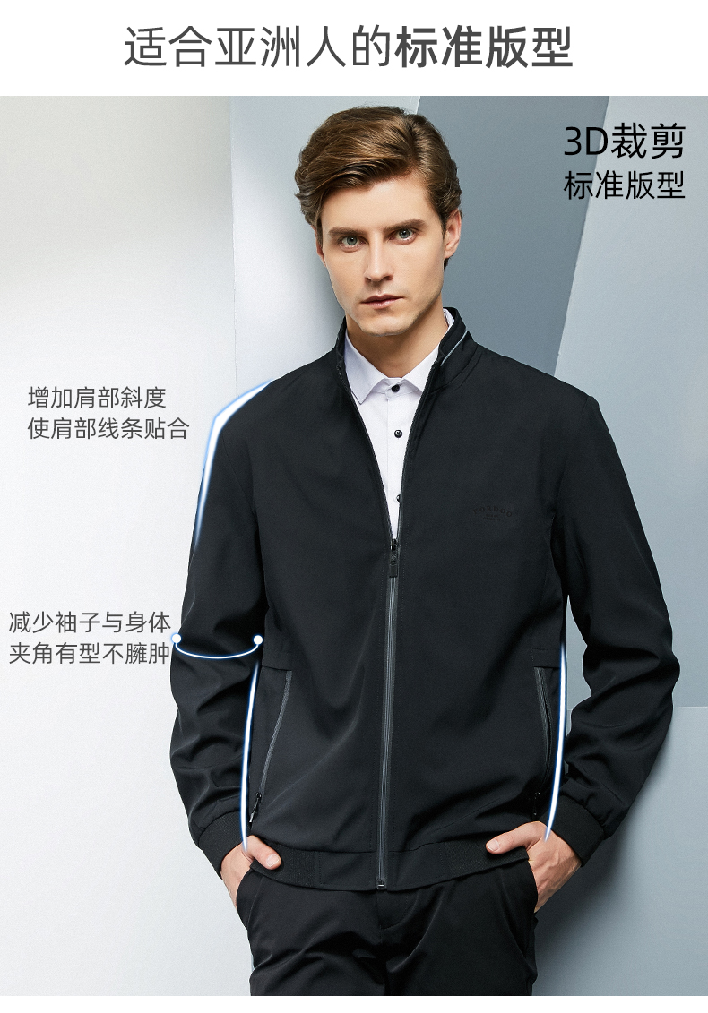 这款外套精选涤纶材质,版型挺括,且不易起球褶皱;表面有光泽,视觉档次也高。立体裁剪工艺,经典小立领+拉链开衫设计,挺拔有型。门襟处使用品牌Logo定制款纽扣和拉链,这些都是高档服饰的配置,细节精致到位。