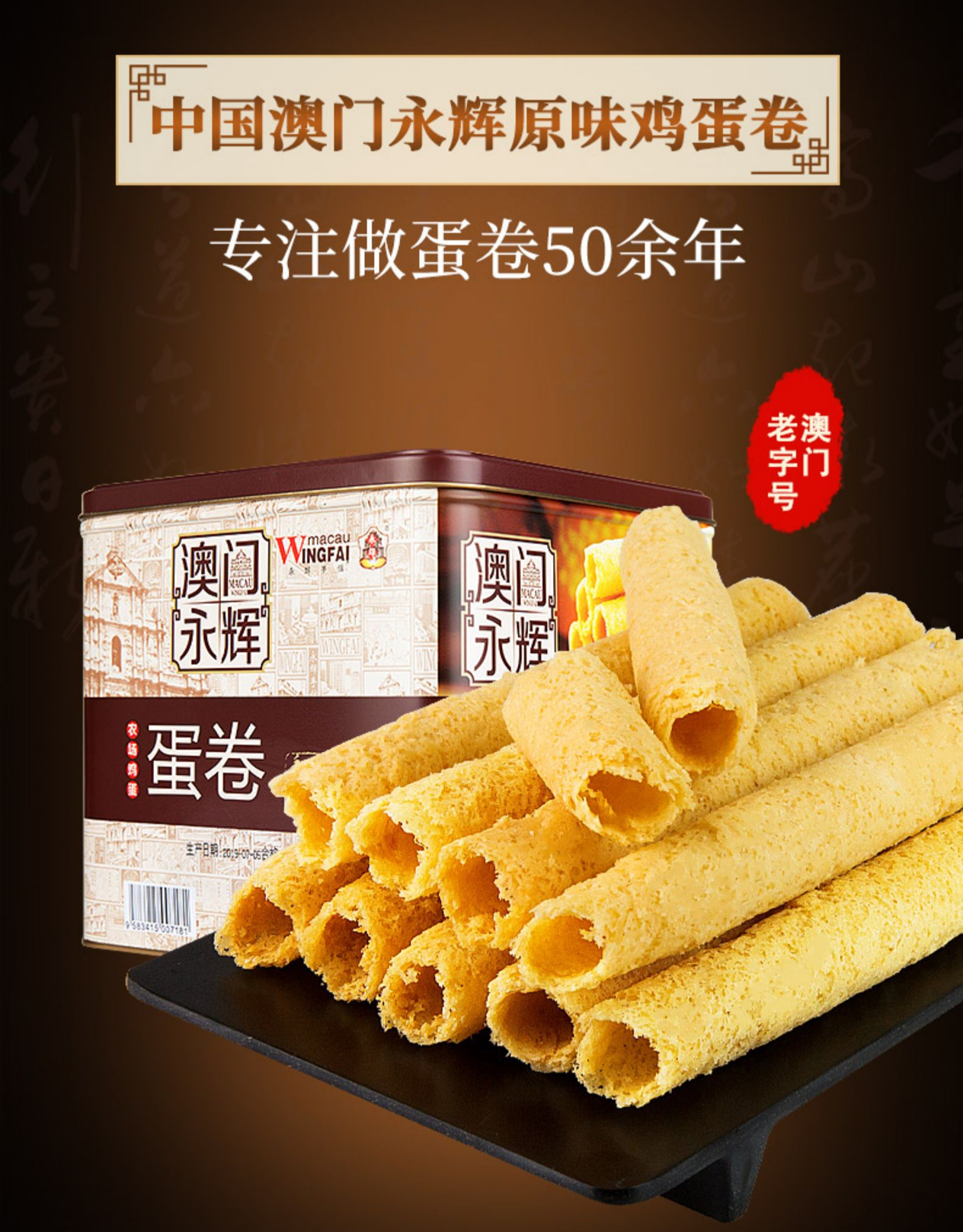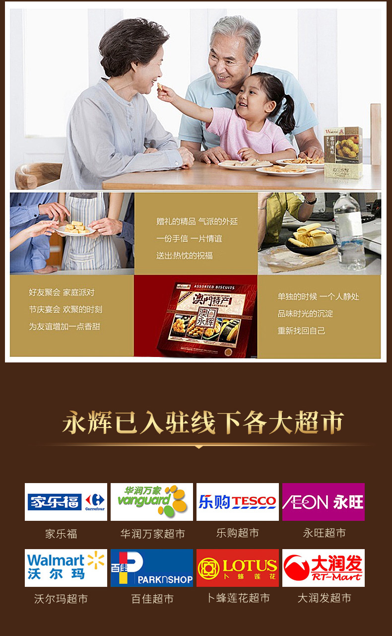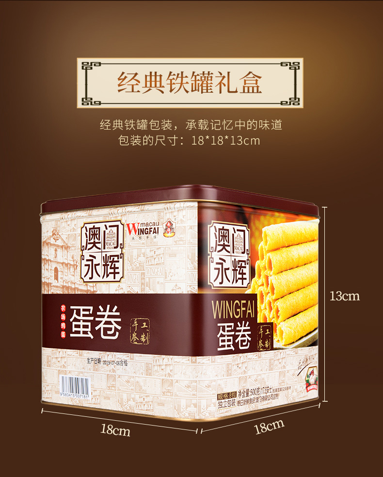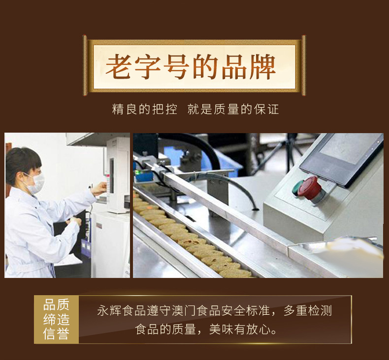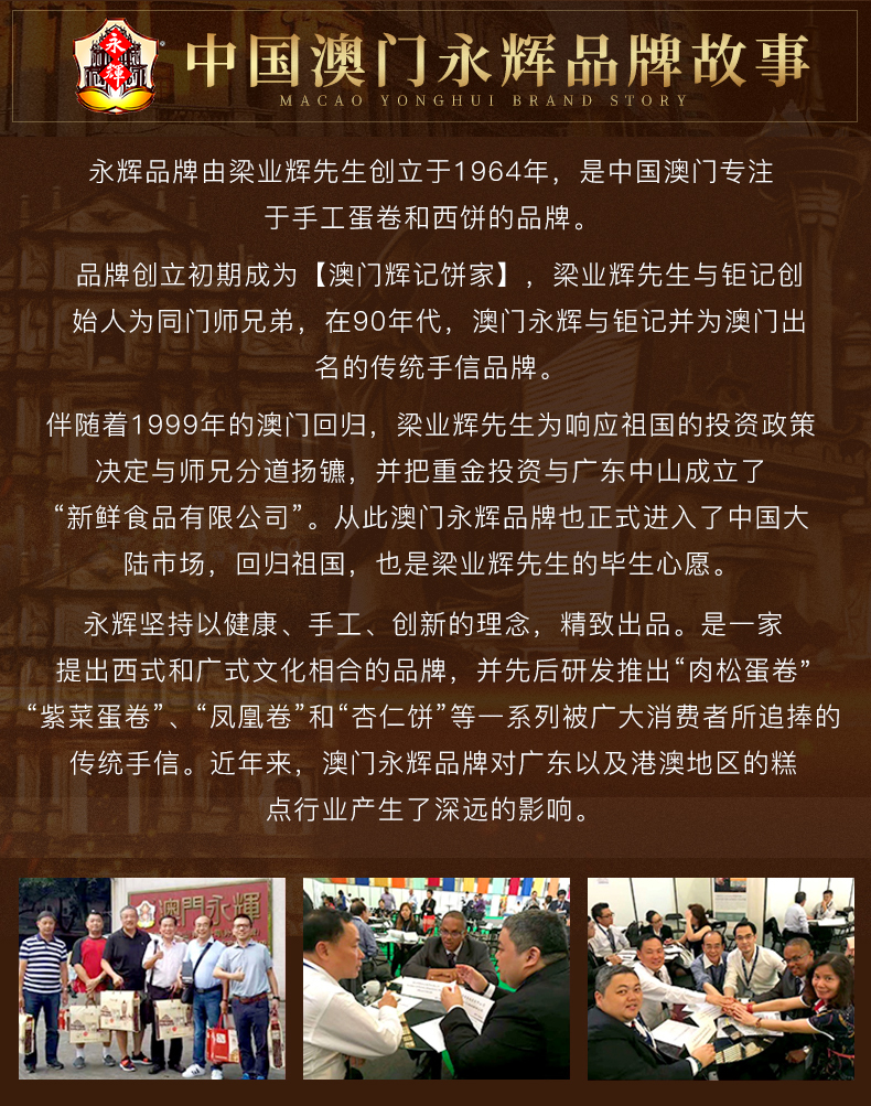 澳门永辉始创于80年代,是来自澳门手信老字号的代表,是传统特色产品的产销一体化企业,80年代初首创椰汁蛋卷皇、紫菜肉松凤凰卷、粒粒杏仁饼并延续至今。澳门永辉初创时,专供澳门各大手信饼家及超市,是澳门首家蛋卷、西饼OEM供应商,专业生产澳门特产。