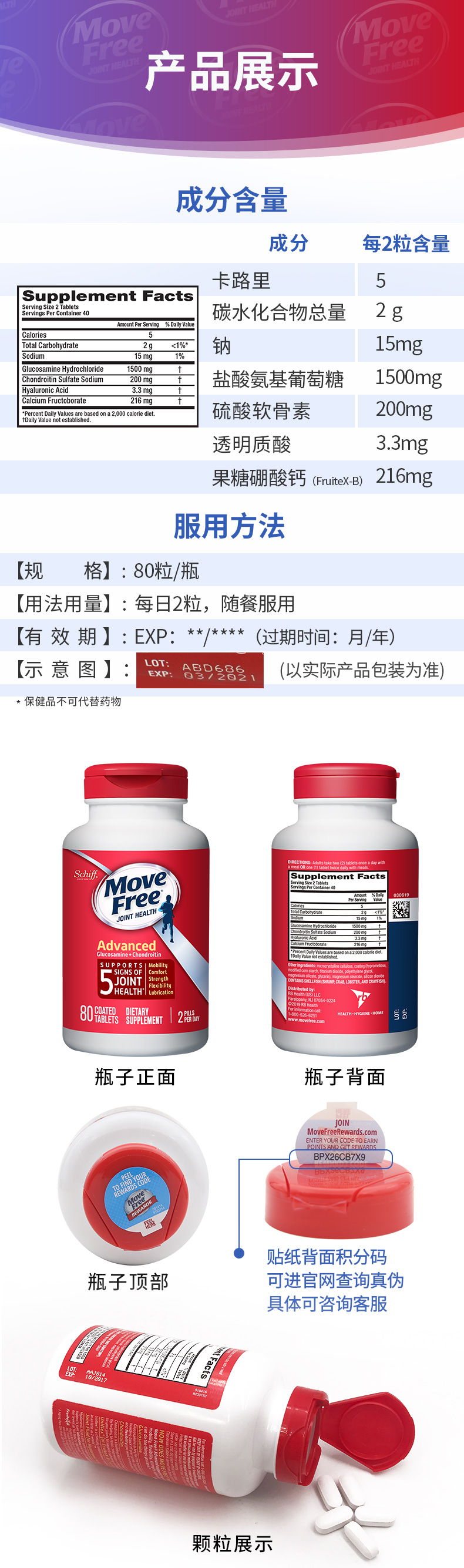 这款维骨力 氨基葡萄糖软骨素,是红盒,美国原产,作用是强化骨质骨骼,修补软骨组织,恢复关节活力,适用于关节轻度疼痛、运动损伤、劳动损伤的人,对于腰椎、手腕/关节、踝关节、膝关节、肘关节、颈椎均有效果;每日2粒,1次或多次随餐服用,规格是80粒/瓶。