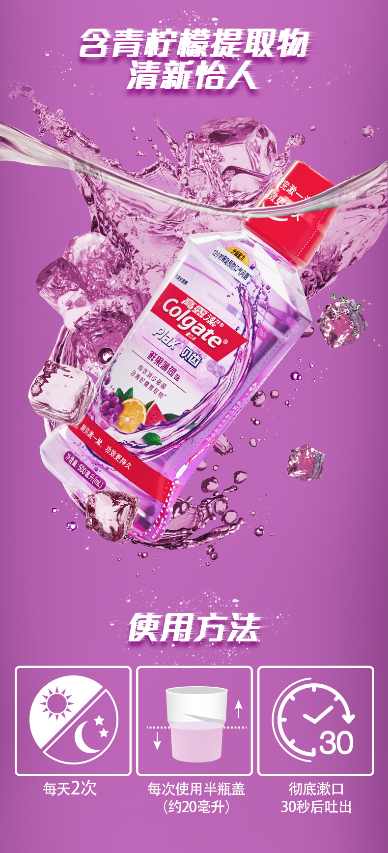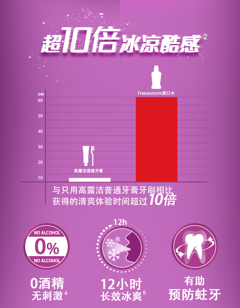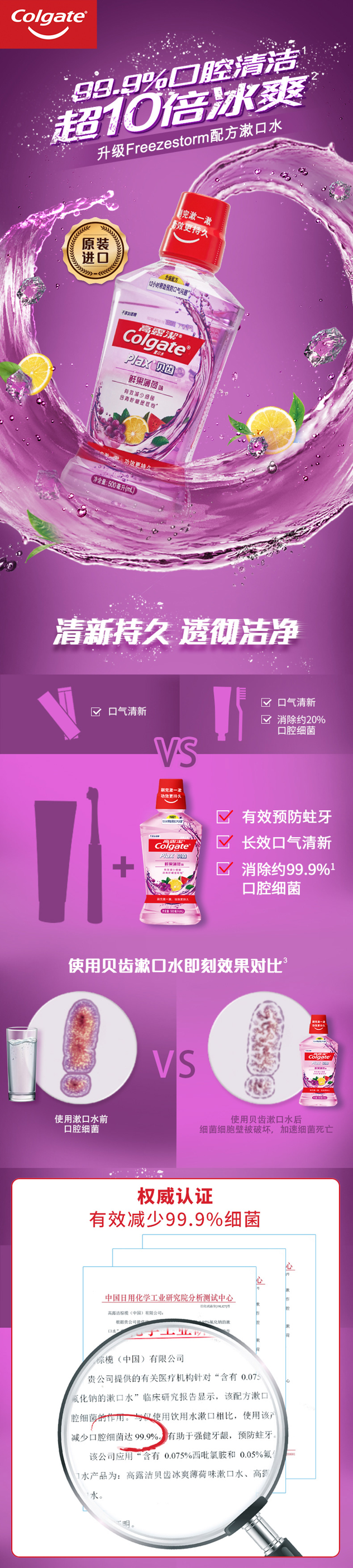 这款高露洁漱口水,采用升级Freezestorm配方,特别添加了青柠檬提取物,0酒精不刺激,能消除约99.9%的口腔细菌,可有效预防蛀牙、长效口气清新,12小时长效冰爽。