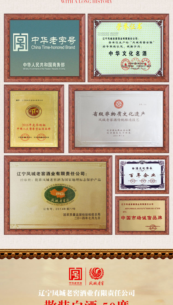凤城老窖是中华十大文化名酒之一,辽东第一名酒,以麸曲酱香,口感纯正著称。辽宁省凤城老窖有限责任公司于1905年始建而成,由爱新觉罗·溥仪皇帝之弟亲笔提名“凤城老窖”。
