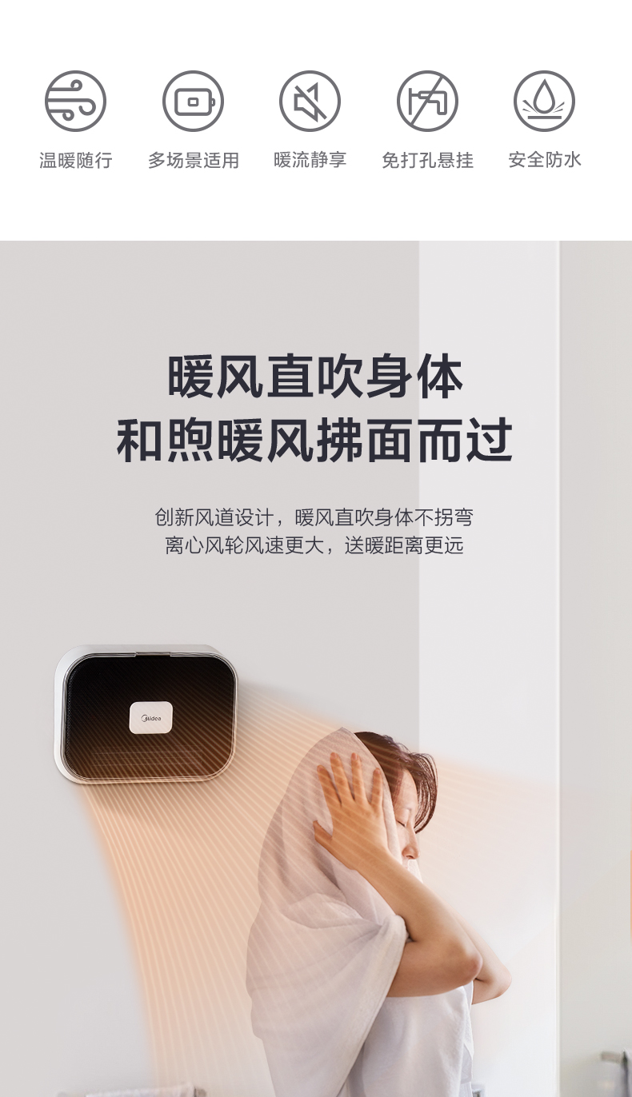 三重防水结构专业设计,有效防止溅水,浴室也可以放心使用。折叠式衣架设计,合金不锈钢材质,创新多合一悬挂机构,可以悬挂毛巾、衣物等等,用来烘干衣物。智能温控,PTC陶瓷内芯,即开即热。