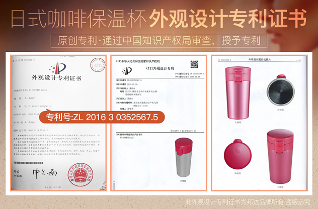 这款邦达 304不锈钢 保温咖啡杯,日式风格,304不锈钢内胆,安全、健康、卫生,高抽真空层,保温效果好;外表有珠光喷漆,精细研磨,光亮,有质感;方便锁扣设计,可单手操作;食品级防滑底垫,放的稳,防滑无静电,桌面无声音。容量是300/370ml。