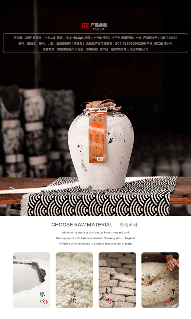 这款抱龙山牌 冬酿花雕,酒精度14%vol,总糖15.1-40.0g/L,酒龄十年。甄选用糯米、小麦、鉴湖水和酒曲发酵酿造,纯手工冬酿,散发着自然米香,色如可乐,粘稠饱满,入口柔和,醇厚甘甜,含有大量人体所需的氨基酸,维生素、矿物质等营养物质。江南的冬天空气潮湿寒冷人们常饮用此酒来增强抵抗力,有养身的功效,规格是20斤坛装。