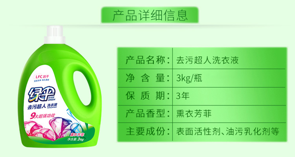 这款绿伞护色深层洁净护理洗衣液,环保无磷配方,散发着薰衣草清香,能深层祛渍祛味,低泡易洗,亮白增艳。