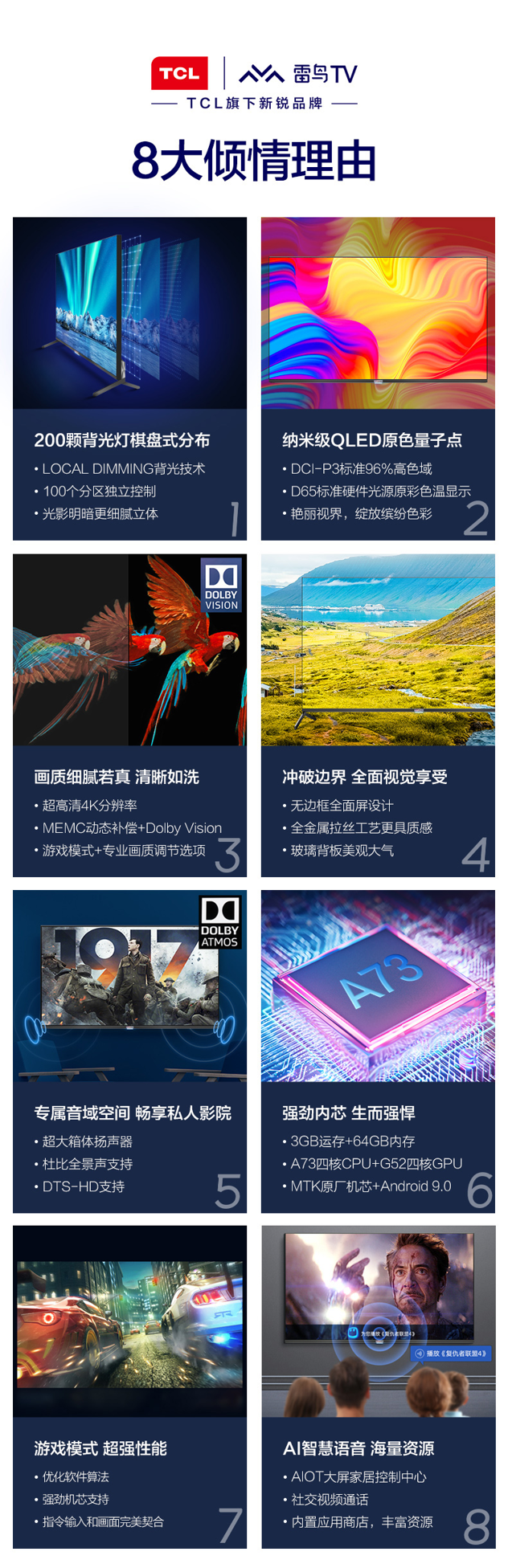 雷鸟 R625C电视,有120个控光分区,量子点广色域,770尼特峰值亮度,运动补偿,同价位确实没有能打的对手,而且也没有东芝6900C身上的诸如音画不同步、画面泛白的小毛病。可以说称得上屠夫级性价比称号,推荐购买。