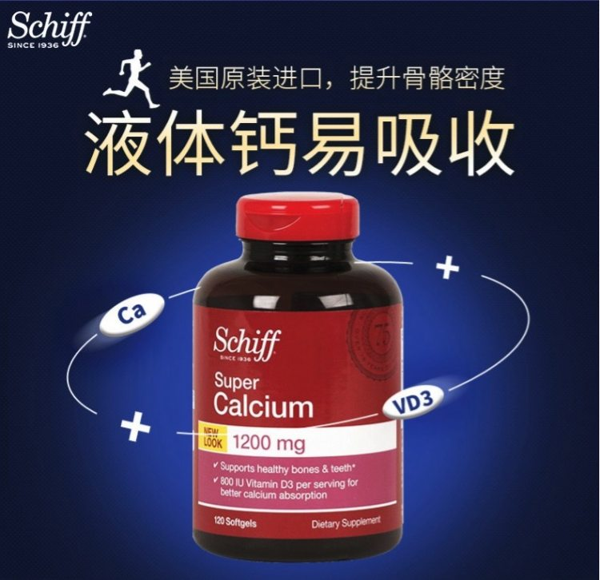 Schiff 液体钙软胶囊,非钙片,美国原产,与普通钙片相比,液体钙不伤胃,同时小分子结构,更易于人体吸收;由于还添加了维D,更加促进了钙的吸收。