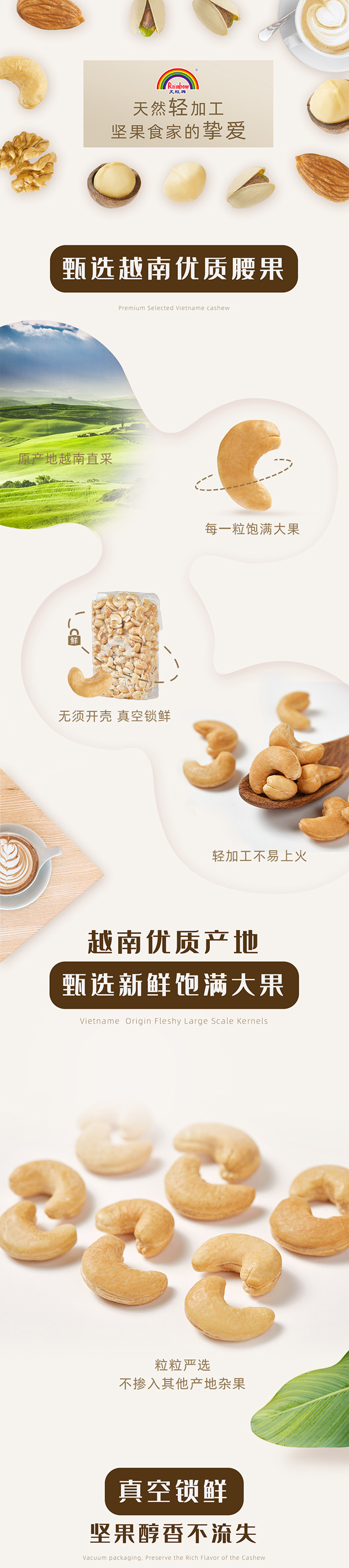大颗粒腰果仁,经过低温烘焙而成,果仁细腻白嫩,清脆可口,营养丰富,9颗腰果仁的营养物质就与牛奶相当,蛋白质含量21.1%,含A、B1、B2等维生素和微量元素。