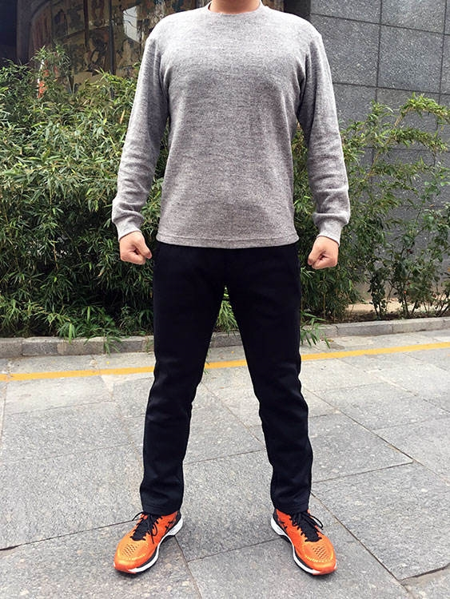 下图是我同事,身高173cm,体重70kg,不算高,腿也不算长,BMI标准。光腿穿的L码修身款,裤腰略宽松,不扎腰带,爬楼梯时裤子会有点掉,但考虑到冬天里面穿秋裤,他还是穿这L码合适,扎腰带就好了。也或许M码的直筒款也可以。