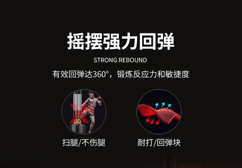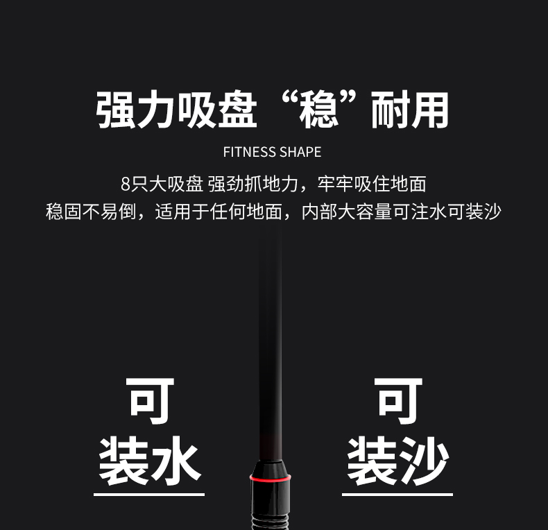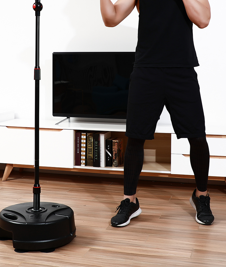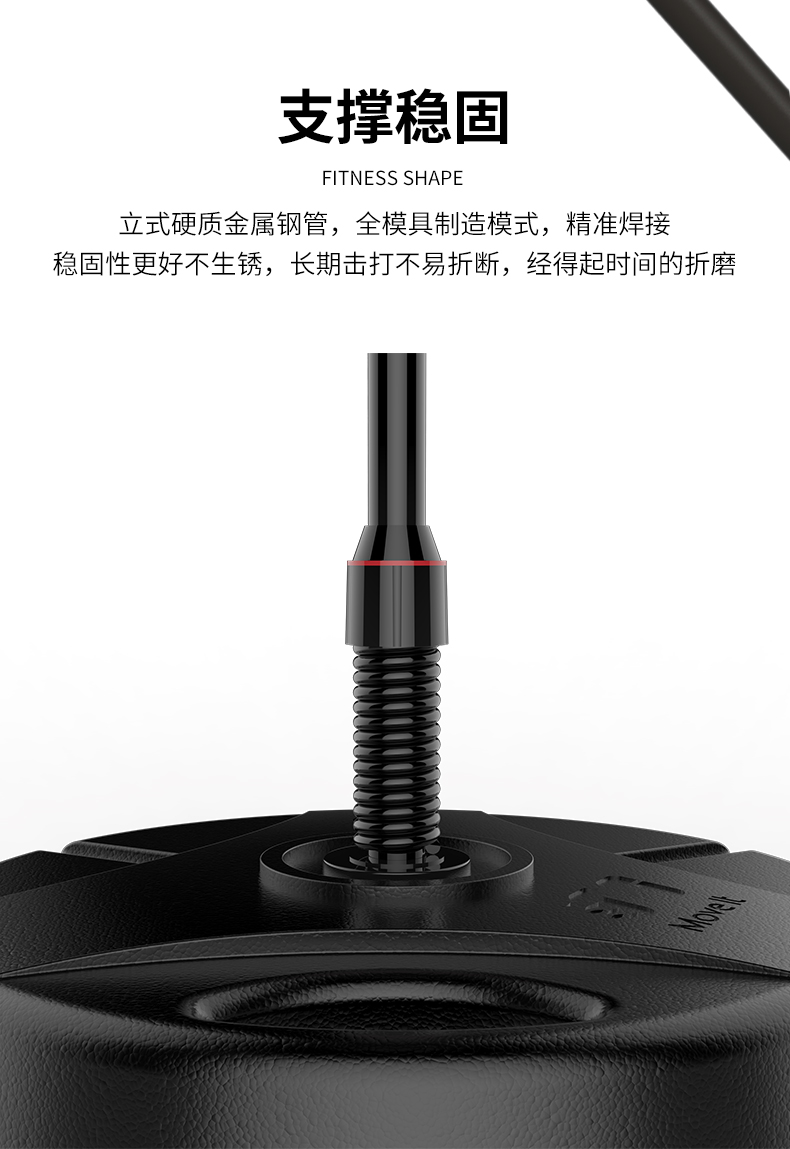 中间支撑使用硬质金属钢管,全模具制造,精准焊接,稳固性好,长期击打不易折断,经久耐用。底座配置8个大吸盘,牢牢抓住地面,并且里面可以注水或装沙增加配重,安装简单方便。并且连接APP可以了解击中率、消耗的卡路里等数据,是缓解压力、健身运动不错的选择。