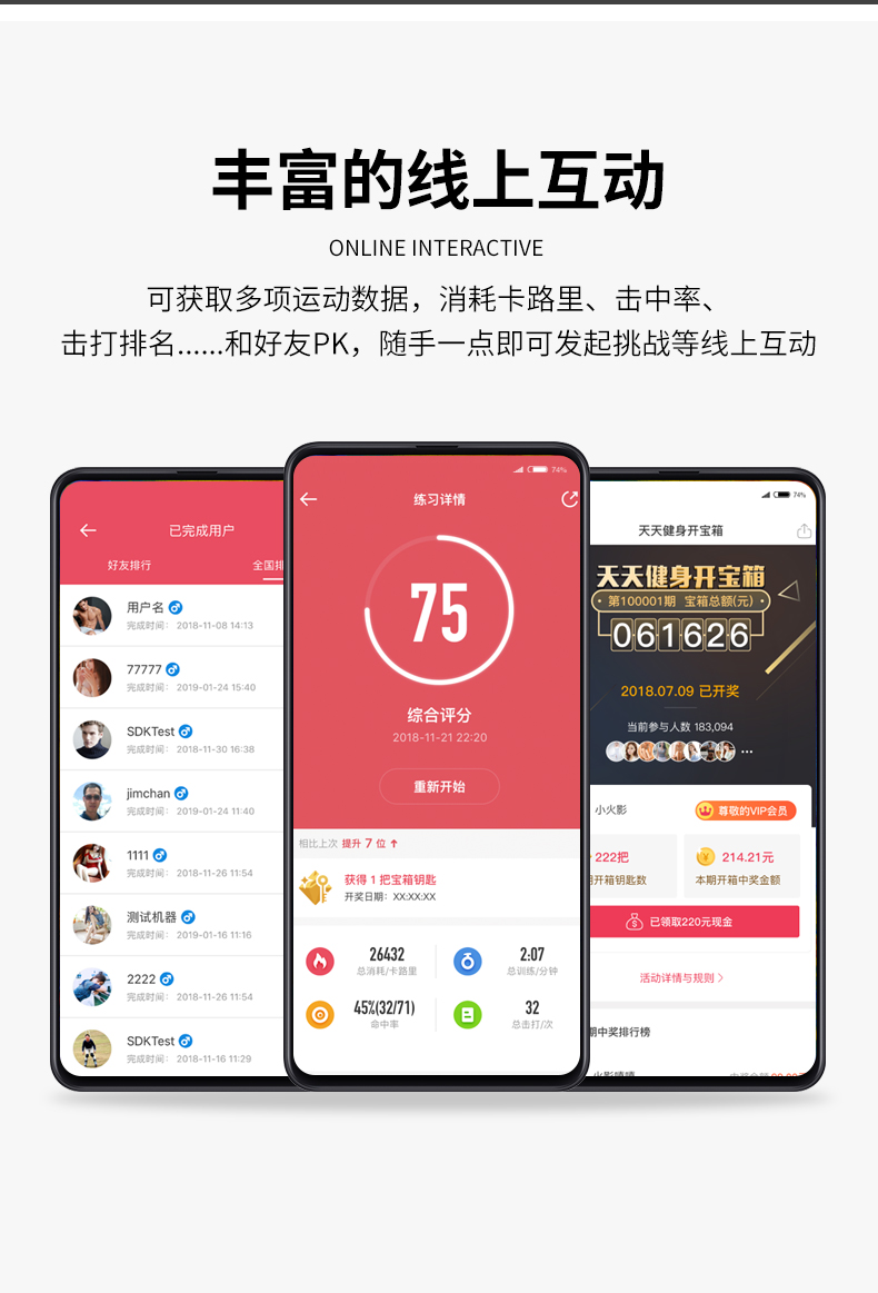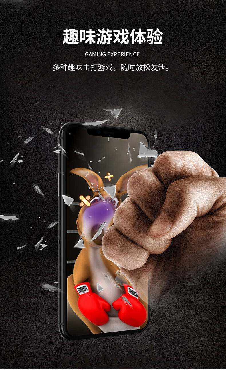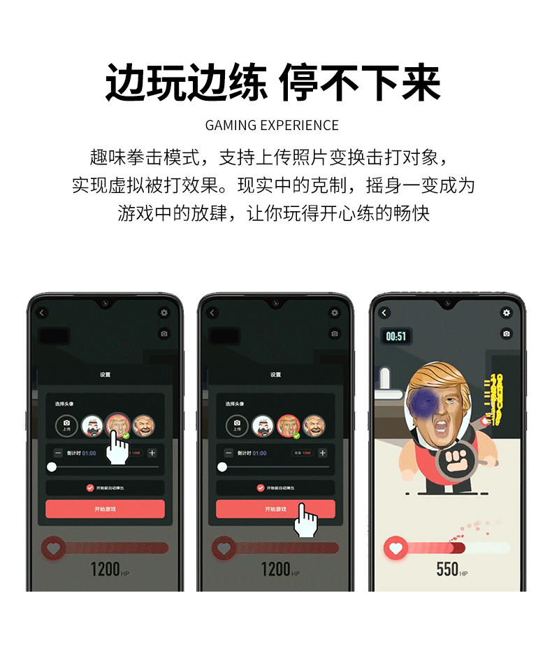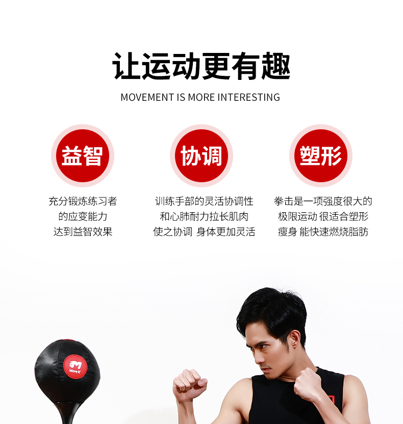 内置多种趣味游戏,支持上传照片更换击打对象,看谁不爽就把谁的照片贴上,是发泄压力的好途径。拳击球有效回弹为360度,很好地锻炼反应力和敏捷度。拳击球表层为尼龙编织PU面料,击打触感好,内胆具有防震功能,美观不伤手,结实耐用。