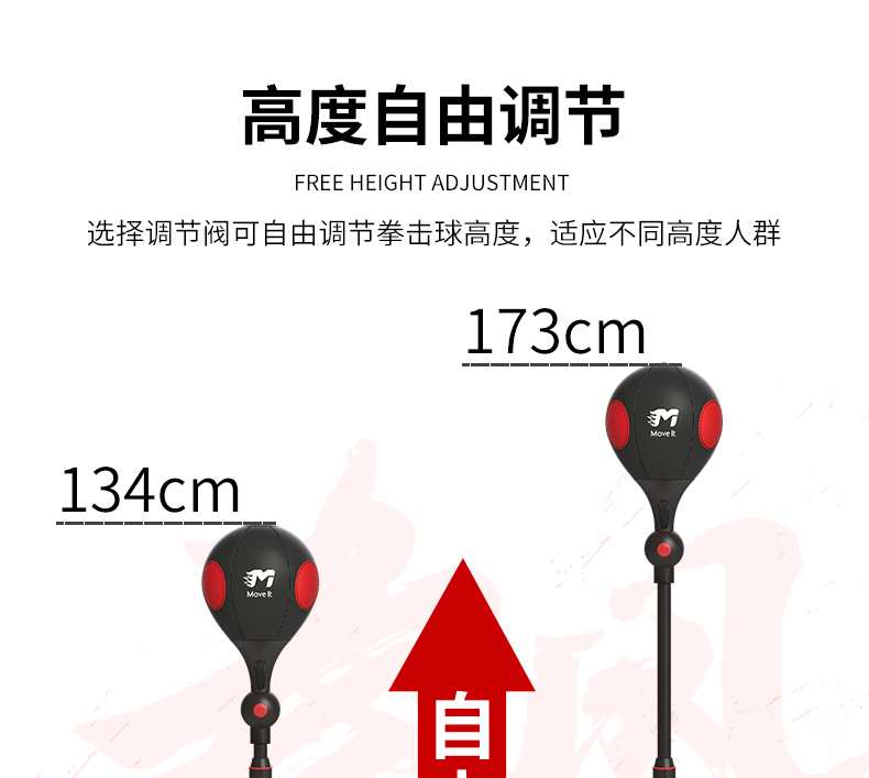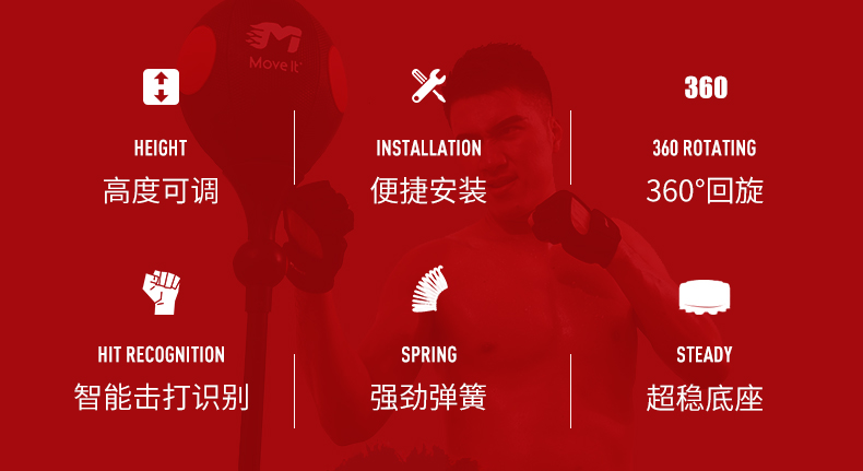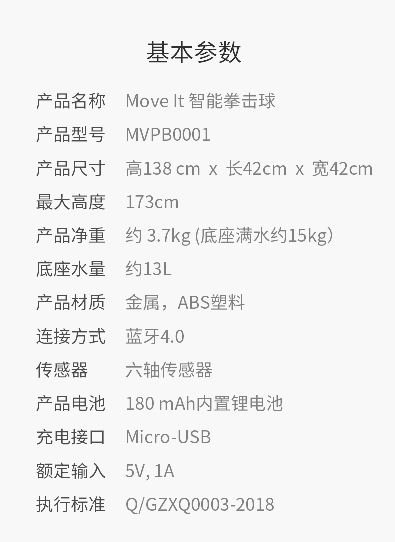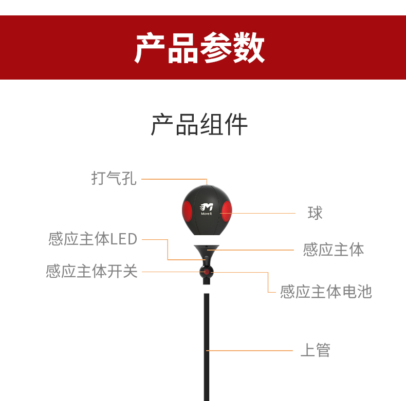 拳击球高度可调节,以适应不同身高人群使用。拥有智能陪练模式,拳击球含六轴感应智能识别,实时获取击打速度、方向等。状态灯外加APP音效反馈,搭配丰富的教学视频,看着手机就能学会拳击。