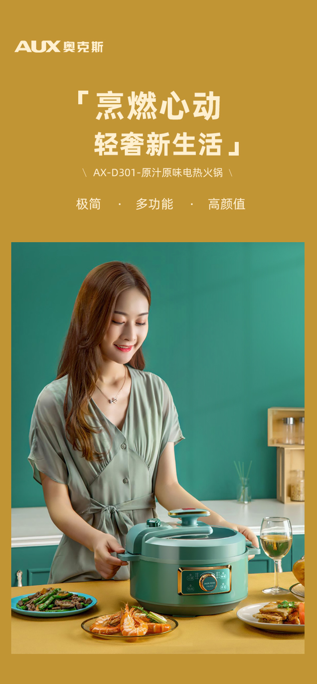 天猫奥克斯共然专卖店,22-24日 火锅节,¥439元 火锅狂欢价,-220元优惠券,=219元 到手价,奥克斯国民小家电品牌出品,多功能电火锅,复古风鎏金墨绿高颜值外观,配备有两个锅盖,高压锅盖和玻璃锅盖,可一锅多用,既可以作为电火锅,也可以作为高压锅,煎炒焖炖样样都行,3升大容量,满足2-5人需求。