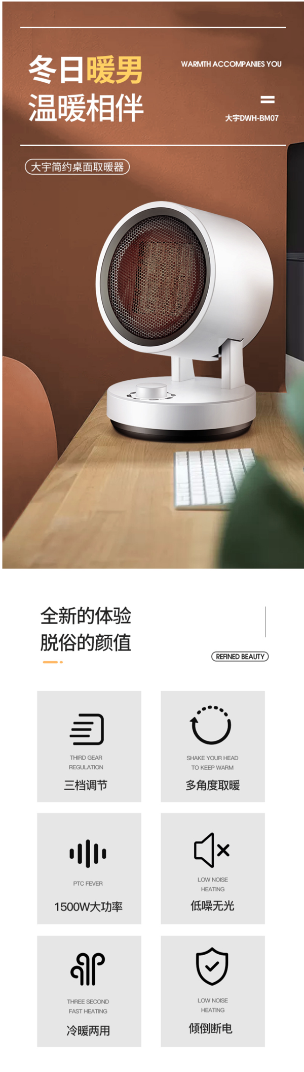这款韩国大宇迷你暖风机,立卧两用,PTC陶瓷发热体,3秒速热,使用时无光源、不伤眼,最大功率1500W,适合15~25㎡的空间使用。
