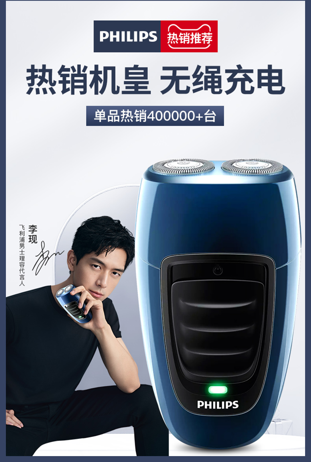 PHILIPS 飞利浦电动剃须刀,小巧便携,充满电后可续航30分钟。两个独立的浮动刀头可贴合面部轮廓进行剃须,自研磨刀片设计。开关防滑设计并带有充电指示灯,充电头无线缆式设计,插头弹出后直接插到电源进行充电。