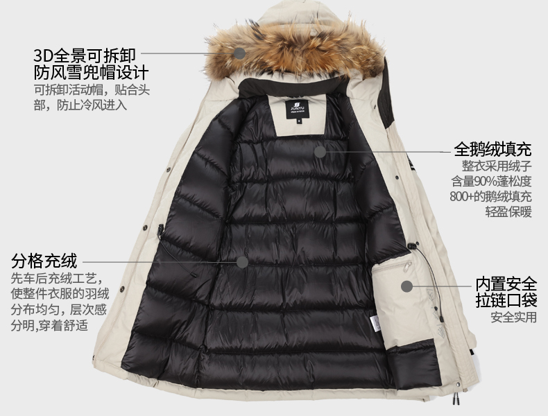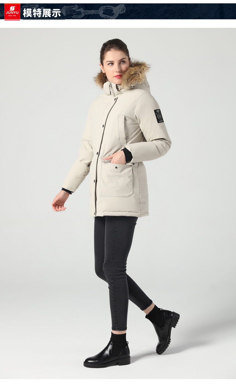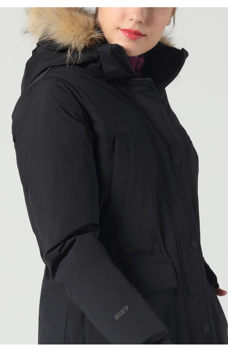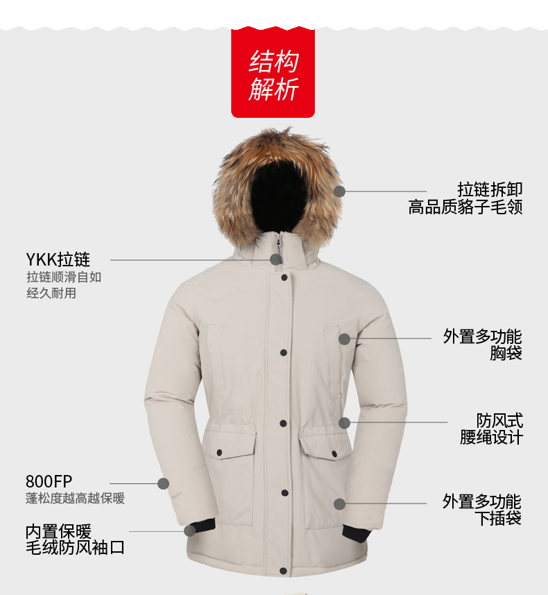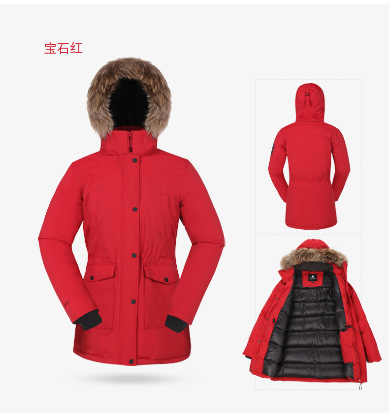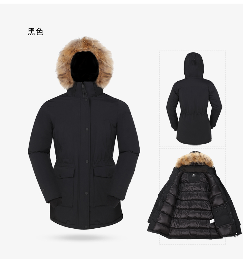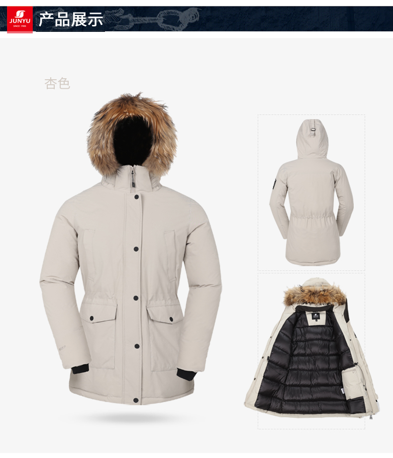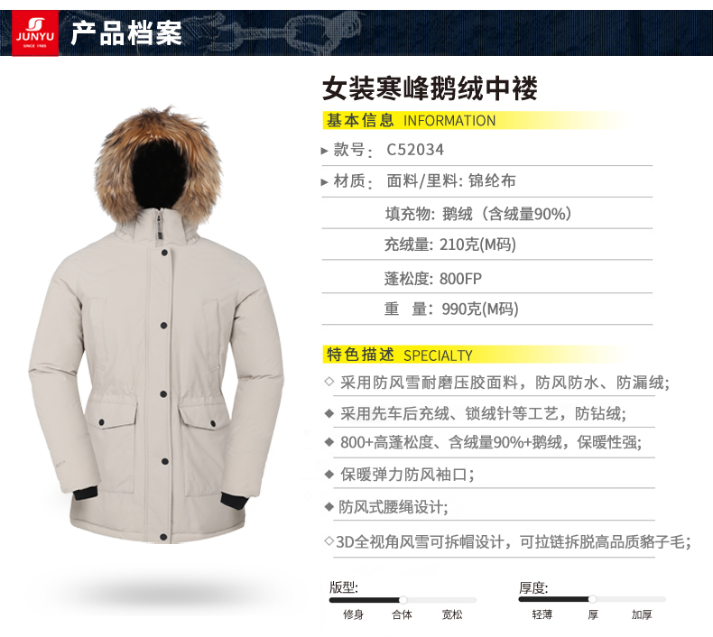 这款君羽寒峰女中长款女士羽绒服,属于酷寒款,可抗-15℃~-30℃,内里填充了800蓬90%鹅绒,M码充绒量210克,属于加厚厚度,防风防雪耐磨压胶防绒面料。直筒收腰设计,长度正好过臀。