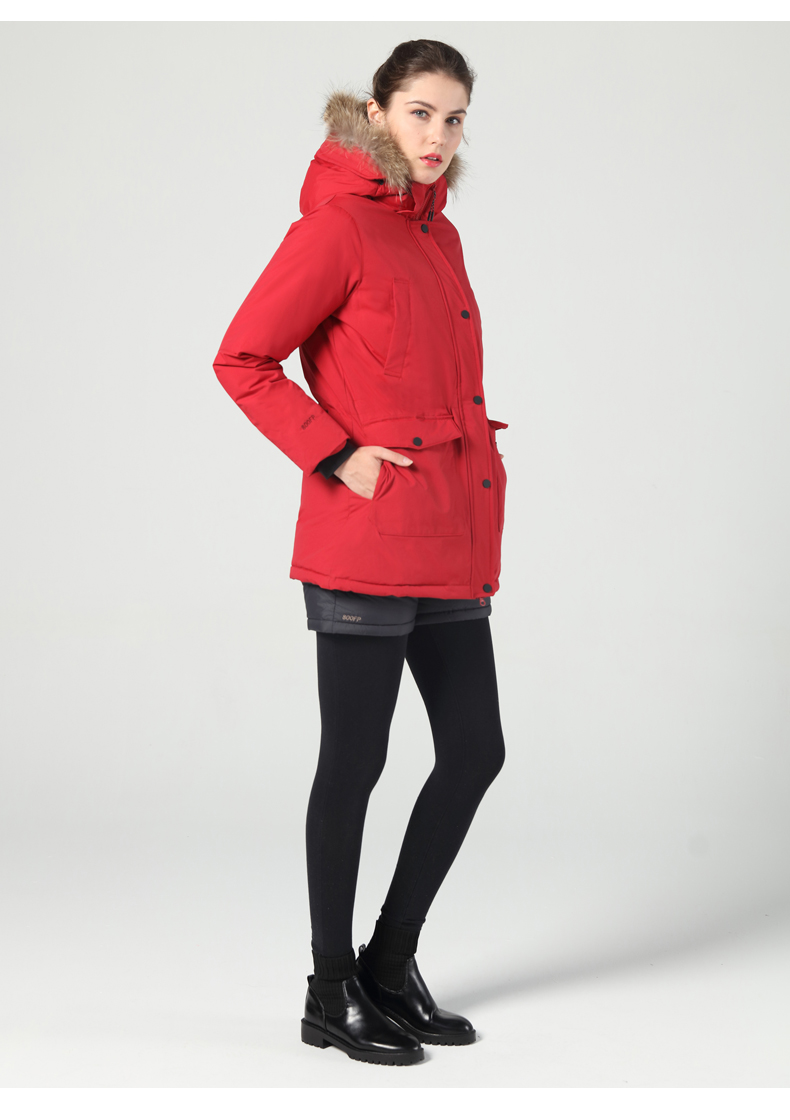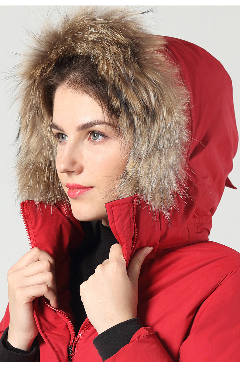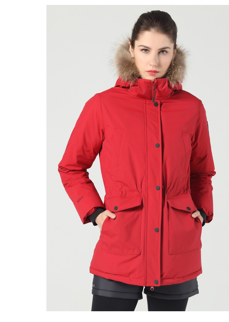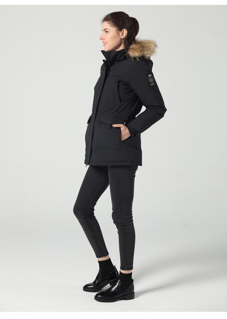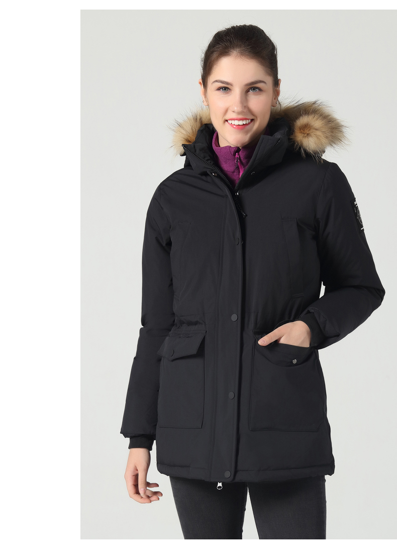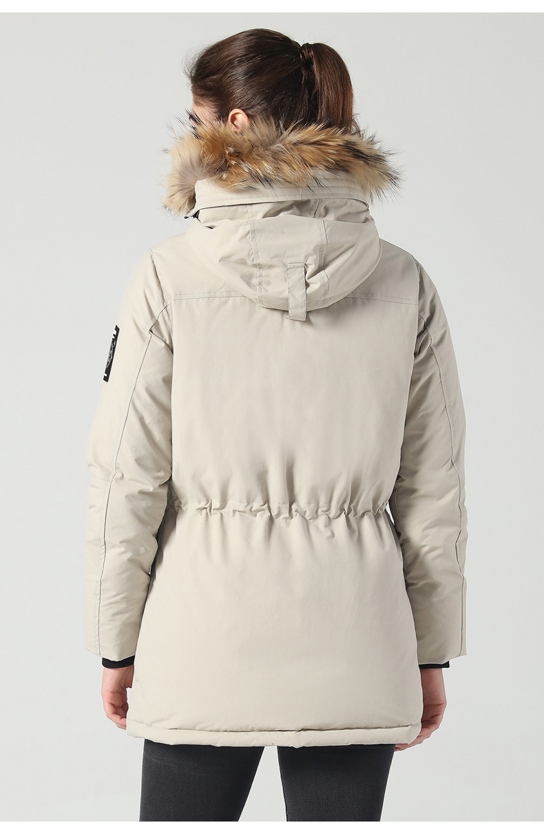 这款君羽寒峰女中长款女士羽绒服,属于酷寒款,可抗-15℃~-30℃,内里填充了800蓬90%鹅绒,M码充绒量210克,属于加厚厚度,防风防雪耐磨压胶防绒面料。直筒收腰设计,长度正好过臀。