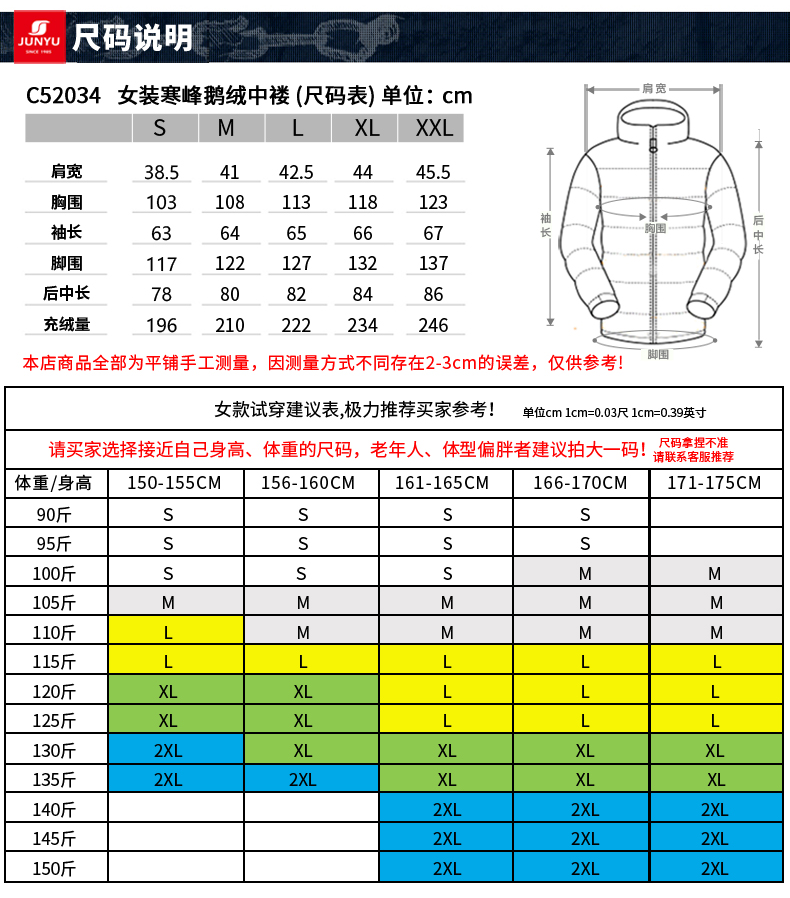 这款羽绒服的充绒量为:M码210克、L码222克、XL码234克、XXL码246克;