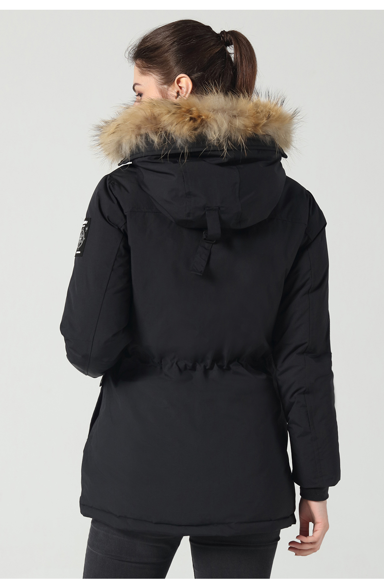 在款式和细节方面,直筒版型,腰身有弹性抽绳,羽绒服是连帽设计,帽檐一圈有用拉链连接的大貉子毛领;双头主拉链和钉扣组合的双门襟,有着更好的保暖效果,所有拉链都是YKK的,防风保暖袖口。