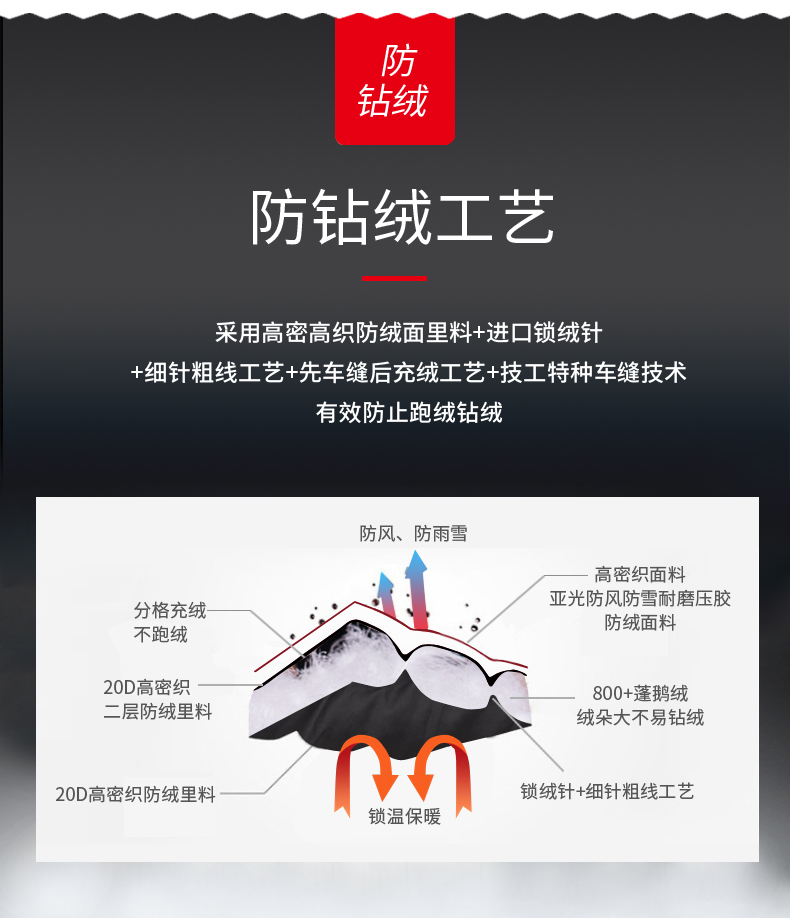 外层面料上,使用防风防雪耐磨压胶防绒面料,防风防泼水,保持面料长期干爽、洁净。羽绒采用先车出羽绒隔舱后充绒的方式,缩绒针细针眼搭配粗线的防钻绒工艺。