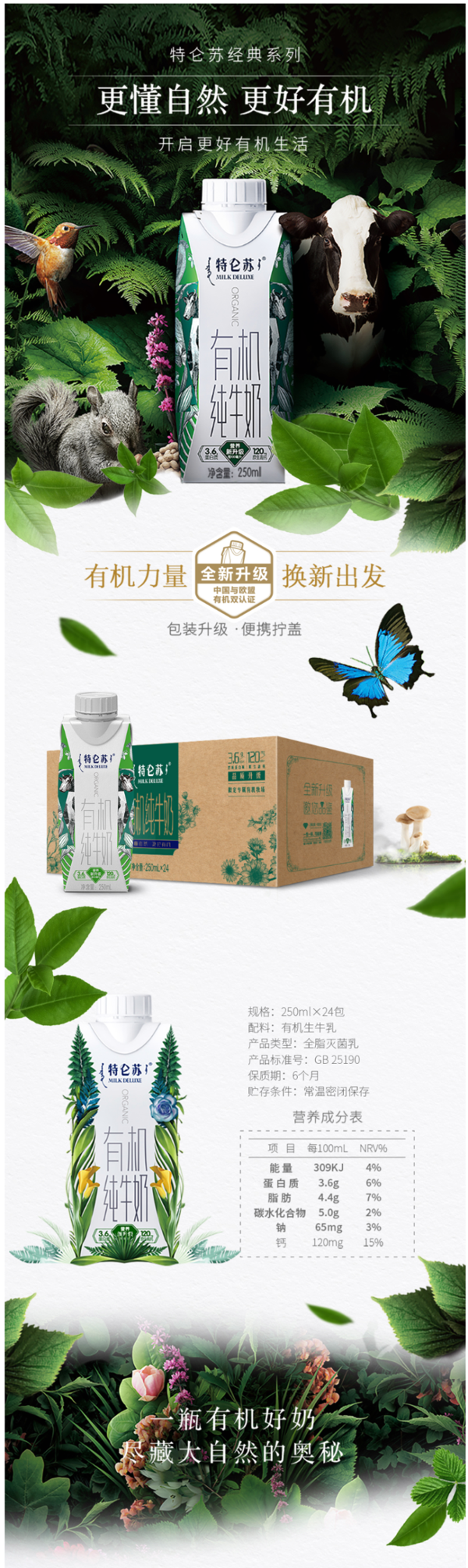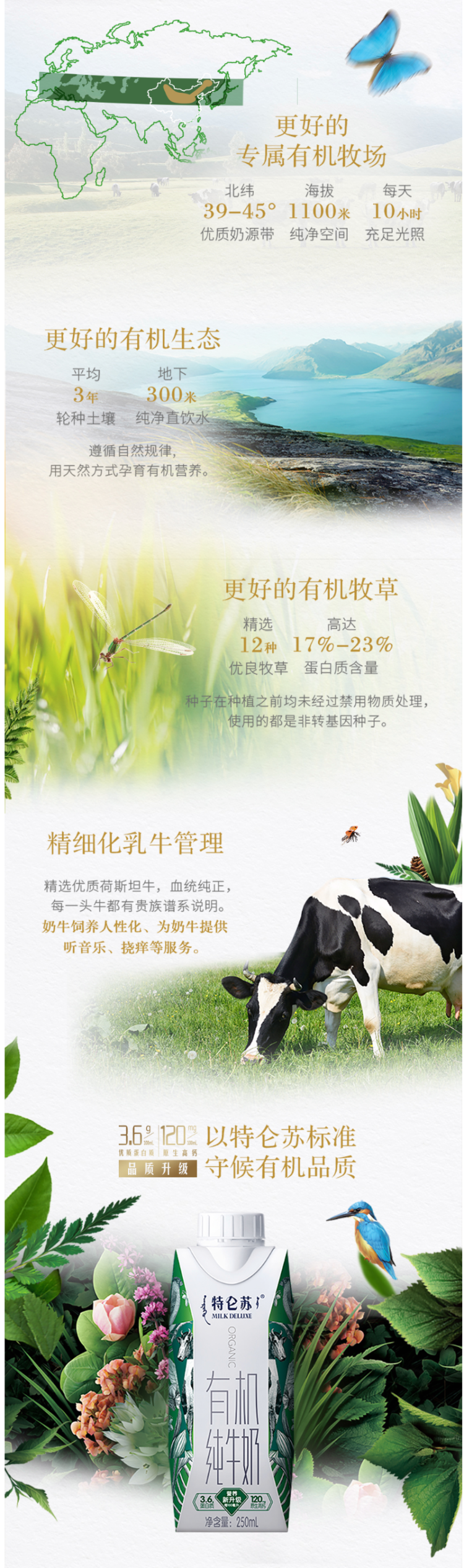 奶源来北纬40°黄金奶源维度带特仑苏专属牧场,沐浴丰沛阳光,享受矿物质水源,连吹的风都是有机的,每百毫升有机奶中含有优质蛋白质3.6g,原生高钙120mg,饮用健康放心。