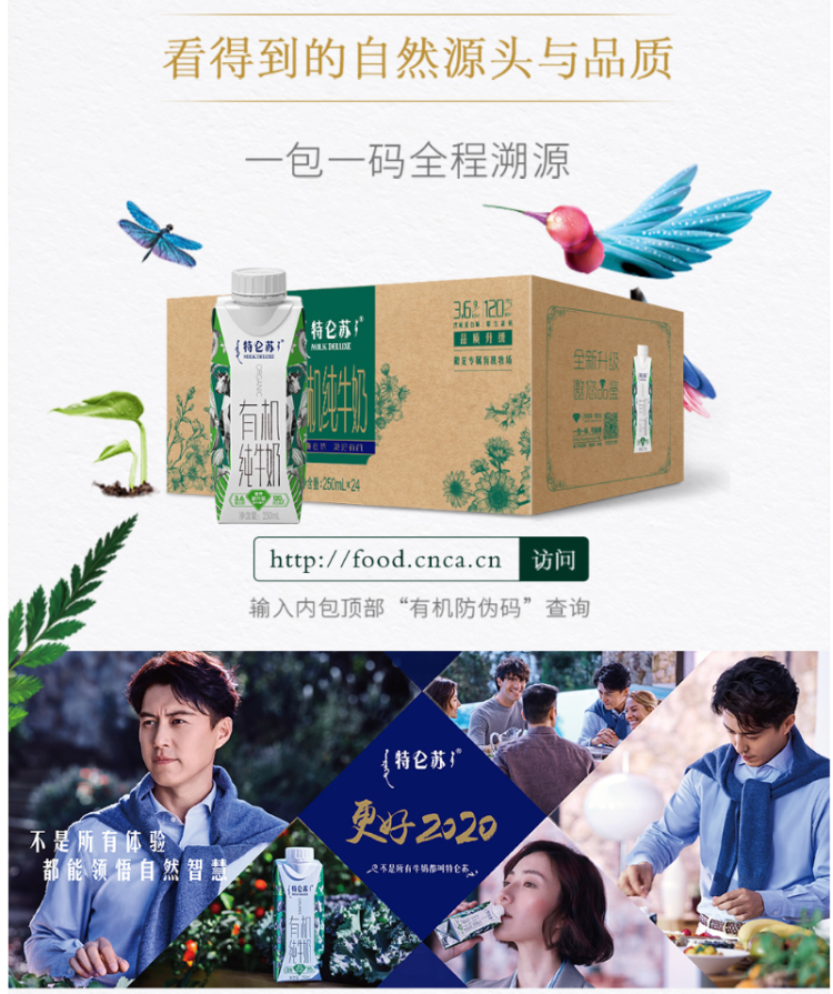 特仑苏是蒙牛高端纯牛奶的代表,而梦幻盖款又是特仑苏中的最高端款,通过了中国和欧盟有机双认证,从饲养到生产全产业链有机,一包一认证码,全程可追溯。