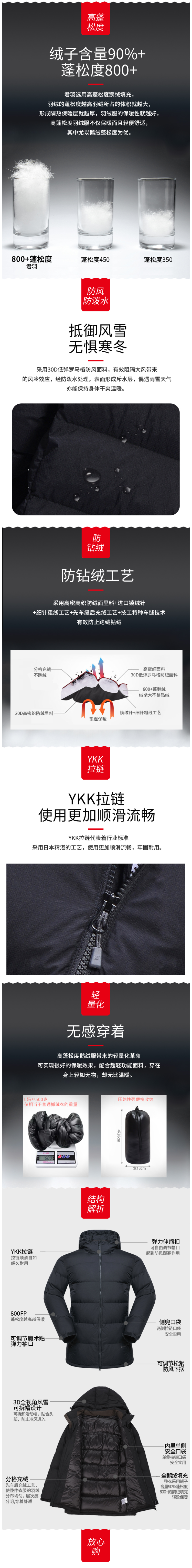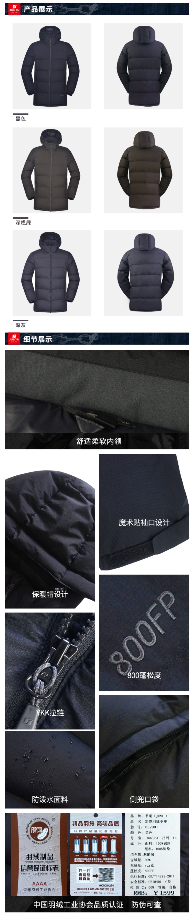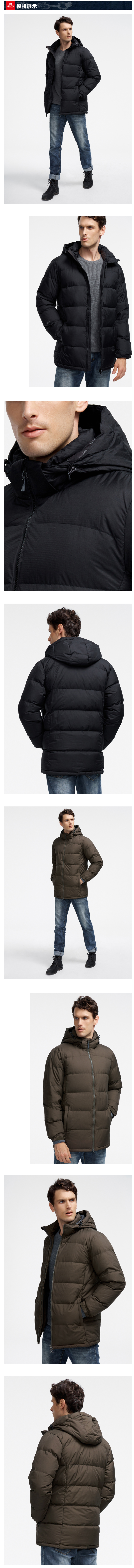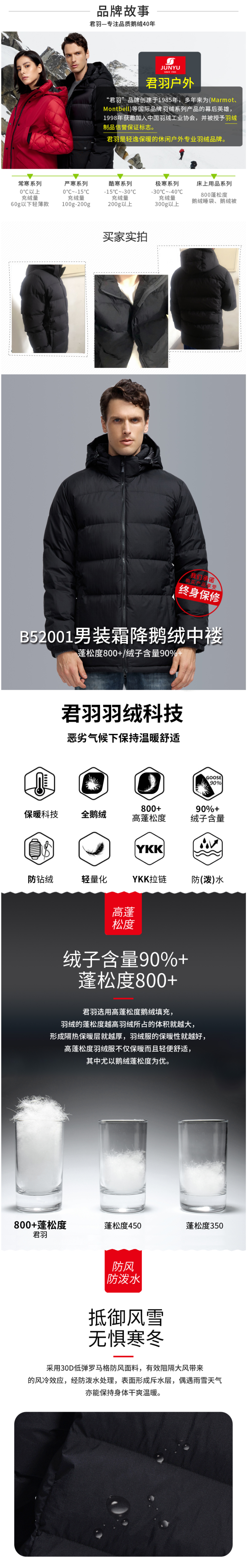 这款君羽是一件派克大衣式的中长款男羽绒服,填充800蓬90%含绒量鹅绒,L码充绒量为160克,外层30D微弹力尼龙面料,防风防小雨。中长款直身版型,XL仅重530克,不超零下15℃保暖足够。