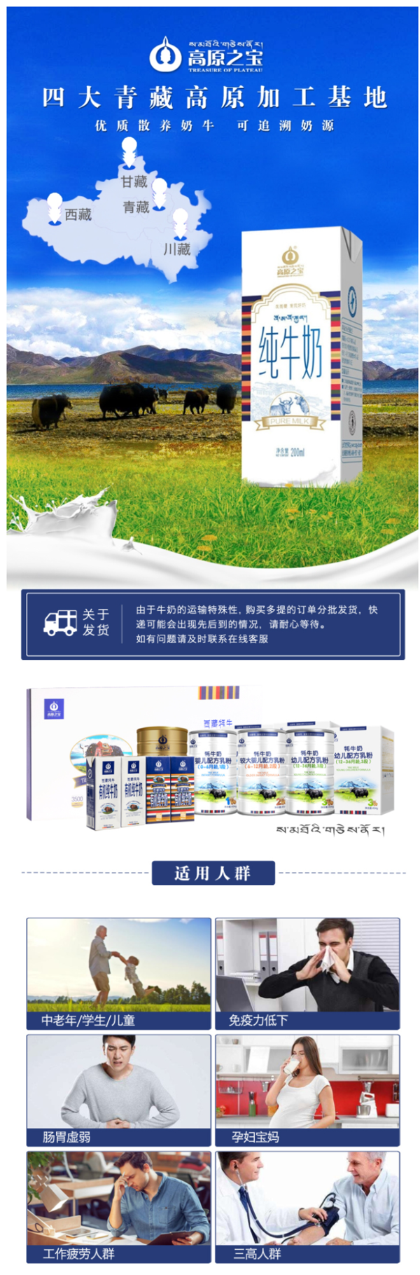 这款高原之宝100%纯牛奶,是一款全脂高钙奶,属于液态奶系列,定位「高营养」、「送礼有面子」,无论是自己饮用,还是送人都完全没问题,青少年、成人都能饮用。