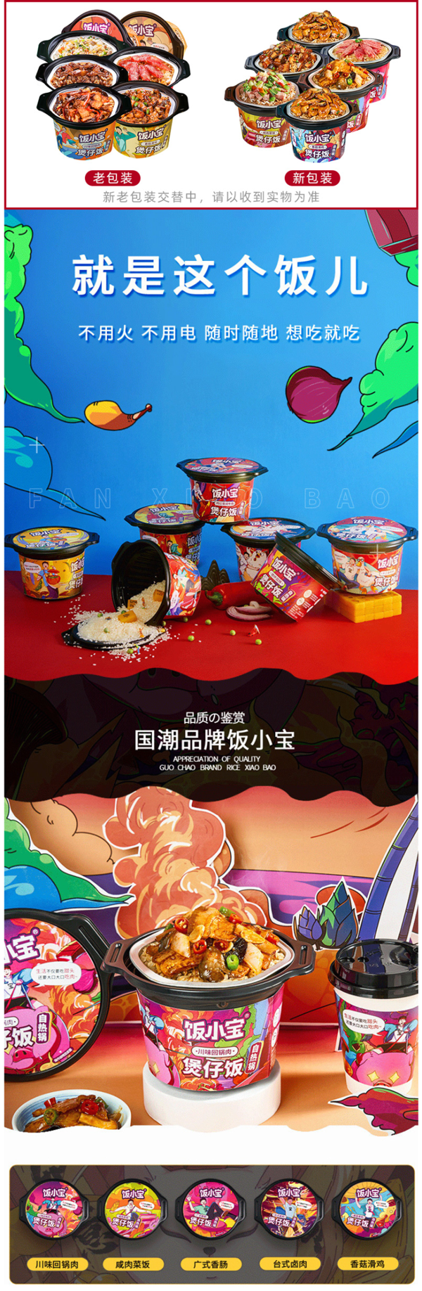 单盒内包含:米包、饭汁包、菜包、发热包、水包。不用明火、冷水加热,等候15分钟即可食用。