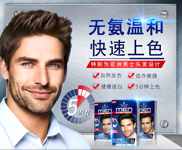 施华蔻男士染发膏,健康遮白,无氨温和,清香不刺激,不伤头皮,快速染发,持久亮色,帅气头发,不留白。