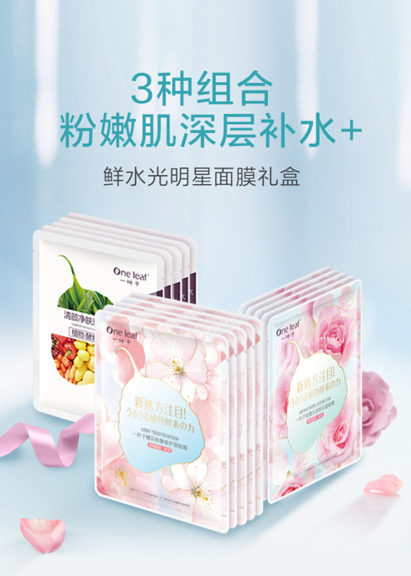 一叶子鲜嫩水亮面膜礼盒,蕴含植物精粹,主要成分:绿茶精华,樱花精华,玫瑰精华。滋润肌肤角质层,温和导入植物精华,使肌肤柔嫩,莹润,有弹力。