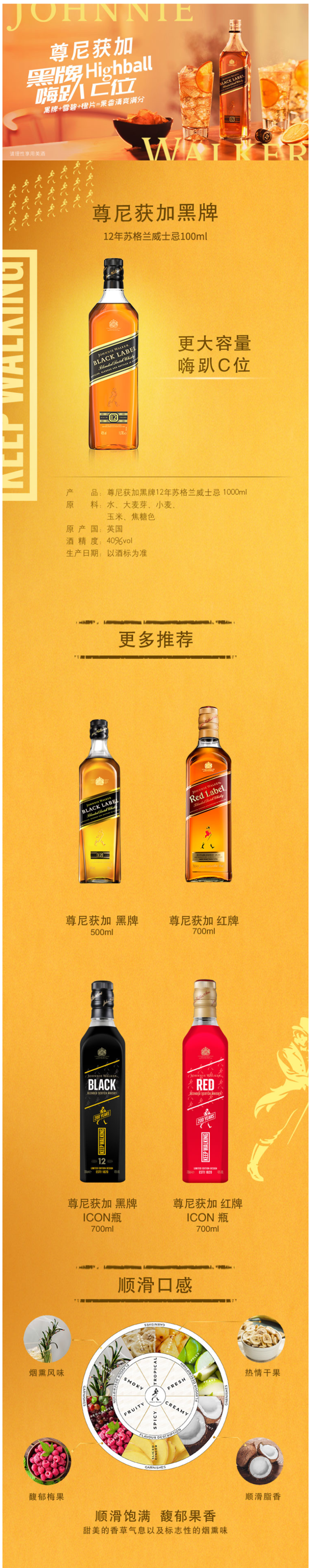 黑牌是尊尼获加最负盛名的一款,也是性价比最高的一款威士忌,12年以上的橡木桶陈酿,经由百年配方调配。