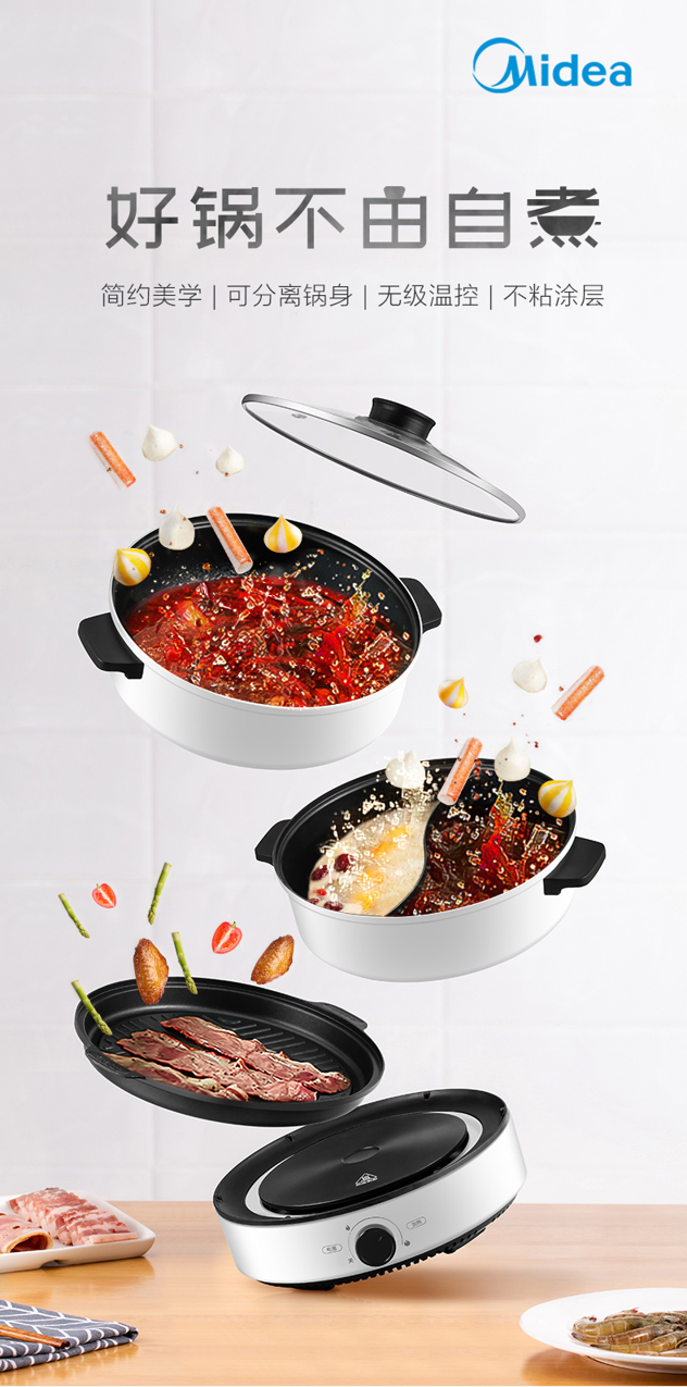 美的多功能料理锅+小型电磁炉的组合,厚实锅身搭配特选的不粘涂层,使用起来不沾不糊,电磁炉模拟传统燃气灶调控方式,无极旋钮控温,煎煮焖炒,一机搞定。