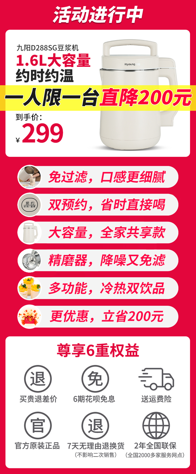 =299元 到手价,这款九阳豆浆机的容量是1.6L,不仅可以打豆浆,还能做枸杞浆、紫薯浆、米糊、果仁露、果蔬汁等,功能齐全。
