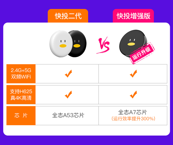 极光快投的增强版,升级为最新的全志A7芯片,运行效率提升300%,反应更快、无线信号更稳定、4K观影更流畅。