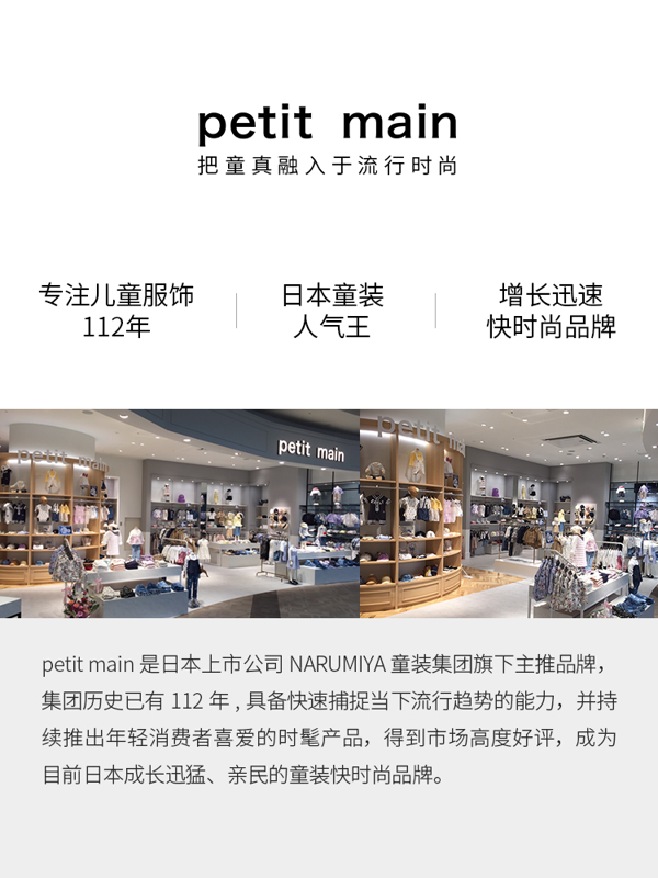 petit main为Narumiya公司旗下主推童装品牌,在日本具有超高人气(日本亚马逊上有售)大型商场百货均有销售。距今已有112年的历史,品牌以“时尚、简约、大牌”为核心理念。将童真融入流行时尚,穿着舒适有范,每季新款都会成为日本人气APP“wear”的晒单王,迄今petitmain已是日本时尚童装的标杆品牌,等到市场高度好评。