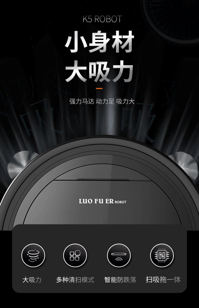 这款罗弗尔 K5 全自动扫地机器人,吸扫拖于一体,先扫(三抓边刷,不伤地板)、再吸(1000Pa的强劲吸力)、最后拖(贴地强力去渍),运行过程中不缠绕毛发;适用于木质地板、大理石,瓷砖,地毯;