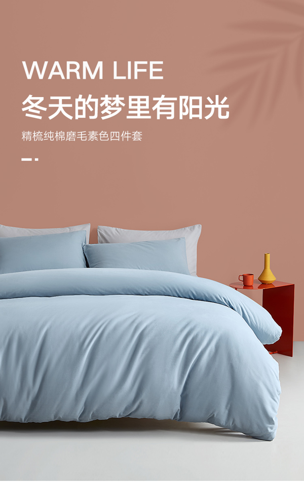 这一款四件套,选用优质新疆阿瓦提长绒棉,长达3000小时以上全年日照,棉纤维细长;采用40支精梳纱合股并捻工艺,140*100面料,真正达到240根,手感更柔顺爽滑。A类母婴级安全标准,无甲醛、无荧光增白剂、更柔软、更光滑、更细腻,裸睡也舒心。轻磨绒工艺,使面料柔软丰盈,增加了保暖性,秋冬触手生温。