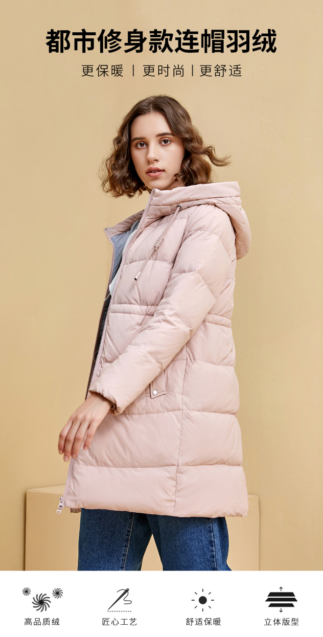 羽绒质感蓬松保暖,搭配四层防护工艺,有效防止钻绒,保持衣服整洁。细节上,双层防风门襟设计,金属拉链提拉顺畅,细节到位。经典中长款设计,时尚百搭。