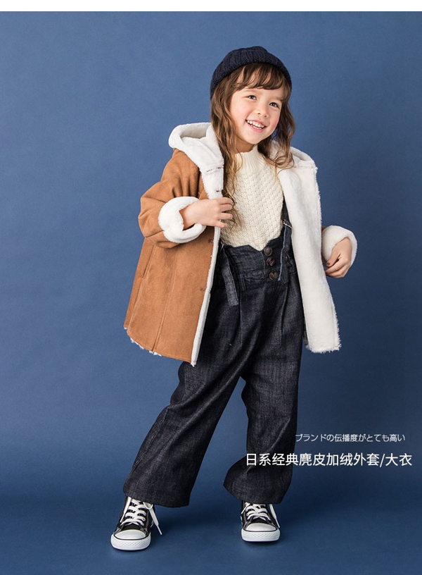 这款加绒麂皮 连帽外套,有白色、卡其色两色可选,材质上选用麂皮,触摸起来特别厚实温暖,有良好的防风性,内里有一层细腻柔软的绒毛,上身非常暖和。经典日系大衣设计,让宝宝可爱又时尚。