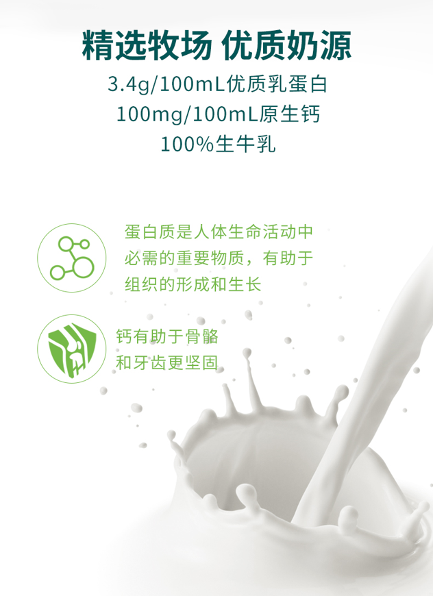奶源源自“黄金牧场”--宝河谷牧场(自由食品集团同一奶源地),原生好奶无激素、无抗生素、无催奶,每100ml原生钙110mg,蛋白质3.2g,脂肪3.3g味道香醇柔滑,营养丰富。SQF、HACCP品质认证;进口货物报关单、出入境检疫证书齐全,品质可靠。
