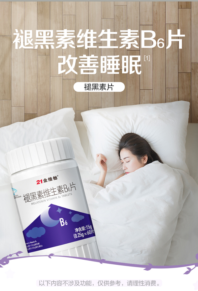 这款21金维他褪黑素维生素B6片,适合用于睡眠状况不佳者,每100g含1.02g褪黑素、0.99g维生素B6,可以改善睡眠、快速入睡。适合成人服用,儿童、青少年、孕妇、乳母忌服,每日1次,每次1片,睡前半小时服用。