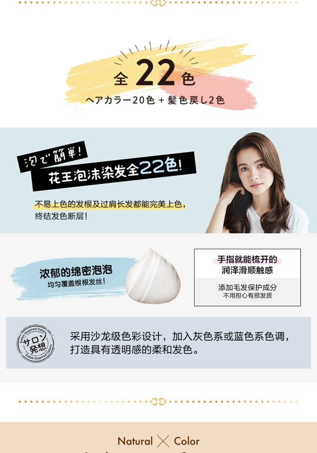 旗下日本花王泡沫染发剂是非常温和的染发产品,泡沫质感让染发变得简单起来,如果肌肤不小心染到泡沫染发剂,清水冲洗就可以,liese prettia是花王旗下很受年轻妹子喜爱的染发剂,全是日系发型最受欢迎的颜色,温柔甜美。染发剂比较温和,染完之后头发会变的柔顺而有光泽。丰富的泡沫很容易涂抹均匀、也很好上色,便于自己在家DIY染发