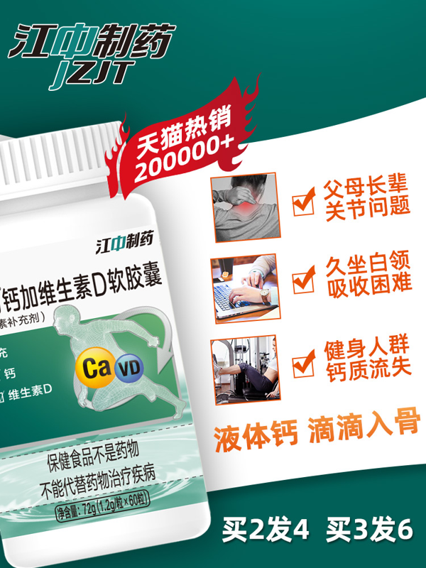 天猫康合森保健品专营店59.9元,可领45元优惠券,实付14.9元到手,药房69.9元一瓶,一瓶60粒。江中制药出品,每粒含有294mg钙+155IU维D3,一天两粒,随餐服用,特别添加维生素D,液体钙小分子结构,更好的促进钙吸收。成人、老人都适用。规格:1.2g/粒*60粒/盒。